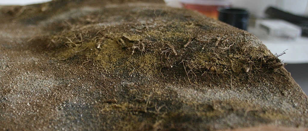 Száradás(kötés) után hígított faragasztós kenegetésre szórt különböző színű föld és kavics szórásával kialakítottam a szín és struktúra egyveleget. A gyökerek, az ősszel kihúzgált egynyári virágok gyökérzetéből vágott darabokból készültek a föld szórással egy ütemben. Kivéve ahol utólag még be kellett raknom, mert ott újra ragasztózás, gyökér elhelyezés és újra föld szórás következett.