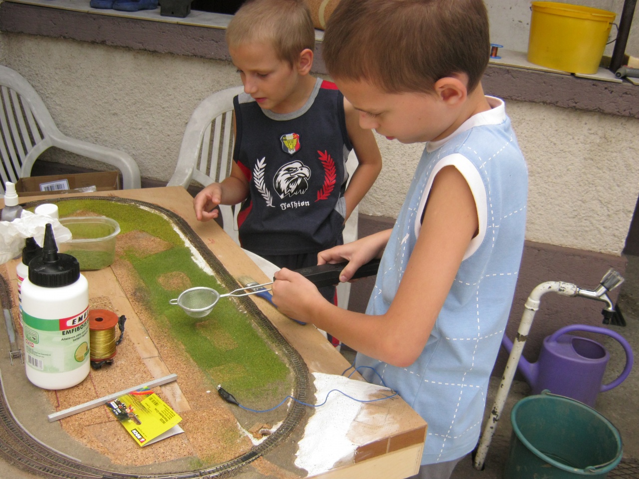 De van még ilyen, ezen a kisebbik gyötri a rezgőcsiszolót, hogy megfelelő legyen az alap a sínfektetéshez. Mondjuk ez sem mai felvétel...  |