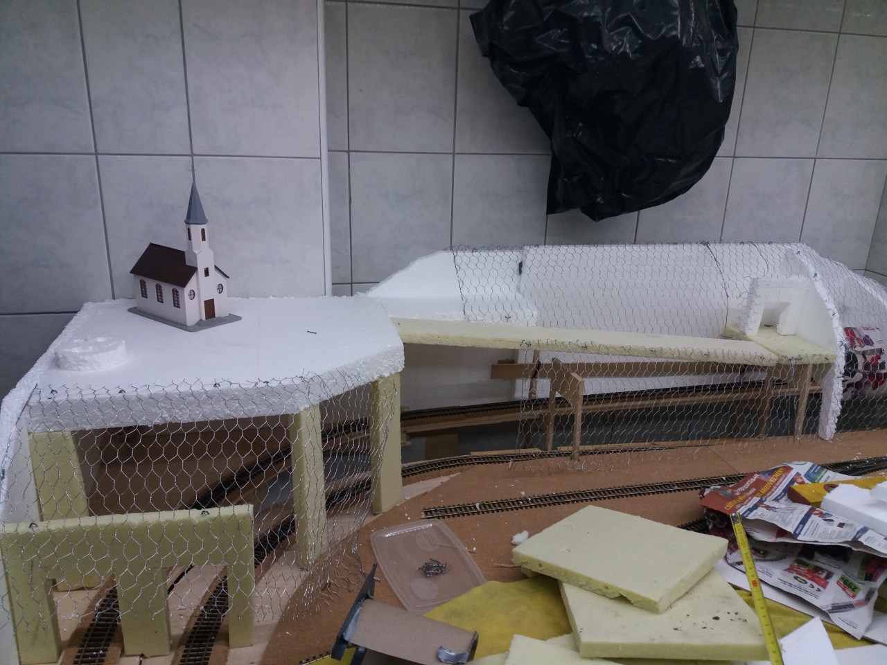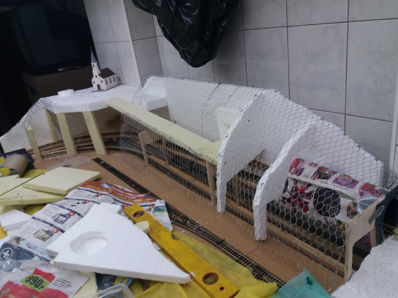 Én úgy tervezem, nem tudom meglehet-e csinálni, hogy a fűre, hungarocellt, -ez könnyen vágható,- vagy valamilyen szivacsot teszek, a sínek alá, a nyomvonalra, hiszen az egész pályám emelkedni fog. Ha sikerült összehoznom, stabilan a kiemelkedő hungarocell nyomvonalat, akkor szeletekből készítem el a terep egyes szakaszait,, bevágás, töltés, meder, stb. Ezeket külön készítem, talán drótvázra, gipszel, vagy ezt is valami tömör anyagból, nem tudom. Egy egy ilyen rézsűt, vagy terepdarabot egyszerűen a nyomvonal mellé teszem és rögzítem. Tehát a mű fű csak az asztal lapja lesz és ahova nem került épített terep, csak ott látszik.