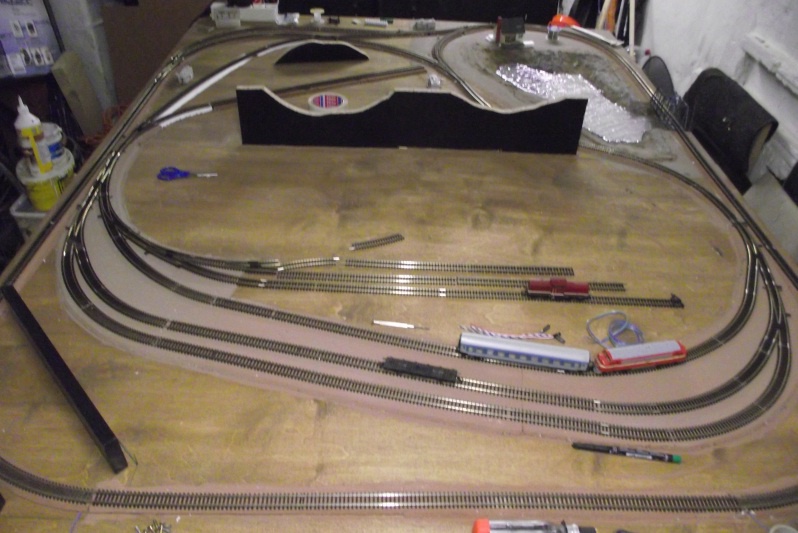 Az előző képen látható "hegy" alagút ki és bejárójába a végleges burkolás előtt elkezdtem a töltés kialakítását. A kavicsokat leszórtam, ecsettel eldolgoztam, majd mosogatószer+víz elegyével beszórtam. Utána fecskendővel (palmatex) faragasztó és víz 1:3 arányú keverékével beáztattam az ágyazatot. Ez két napja történt, de a töltés kb 60%-a még mindíg laza.