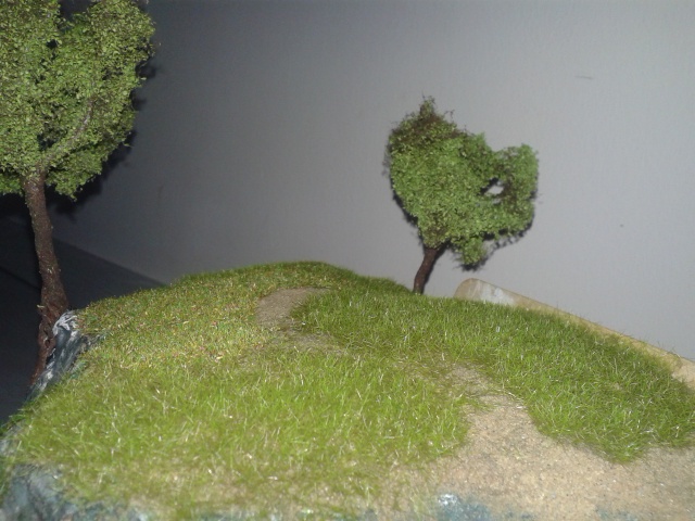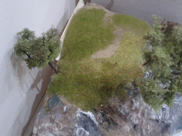 A hungarocellt (stb) egy latex alapu festékkel festem be elöször (vastag festék, gyakran gipszet is keverek hozzá, hogy még vastagabb legyen. Ez adja a terep alapszinét ( nagyon ronda ha a fü alul kikukucskál a fehér hungarocell). Az alap lehet világis barna, szürke vagy vöröses földszin. Ha ez megszárad, bármilyen viz-, tempera, akril stb. festékkel alakitom ki a végleges szint. |