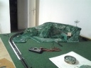 Az érintett "hegyoldal" alatt alagút fut. Itt hungarocellből elkészítettem a domborzat gerincét, utána gipszpólyával a felszint (1kép). Ez a felület azonban festés után is elégt bizar látvány volt. Ezek után a teljes felületet gipsszel leöntöttem (ezt neveztem gipsz alapnak). Így a felszin lényegesen realisztikusabb. Ha kiszárad jöhet a festés. Na ez az amiben még kevés rutinom van. Egy két próbát tettem de még nem az igazi.