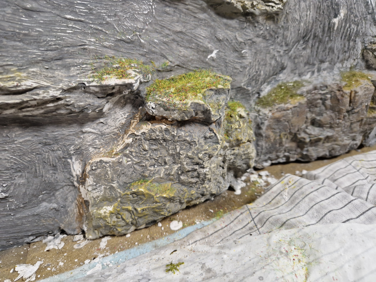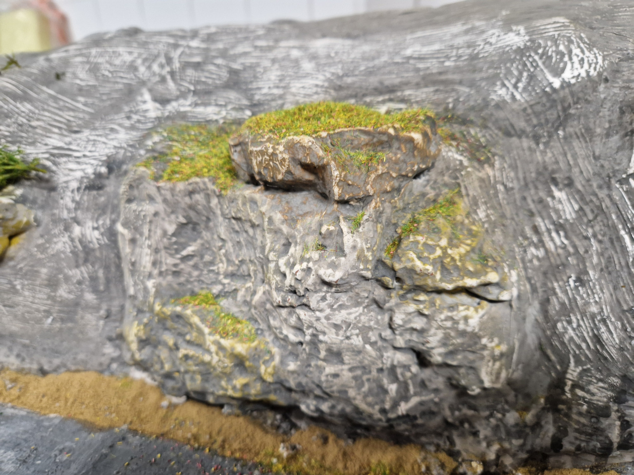 Végre összeállt az asztal. A terepépítés az egyik felén már majdnem befejeződött. A sziklás részt kb 3x kellett újrafesteni mire ezt elértem. |