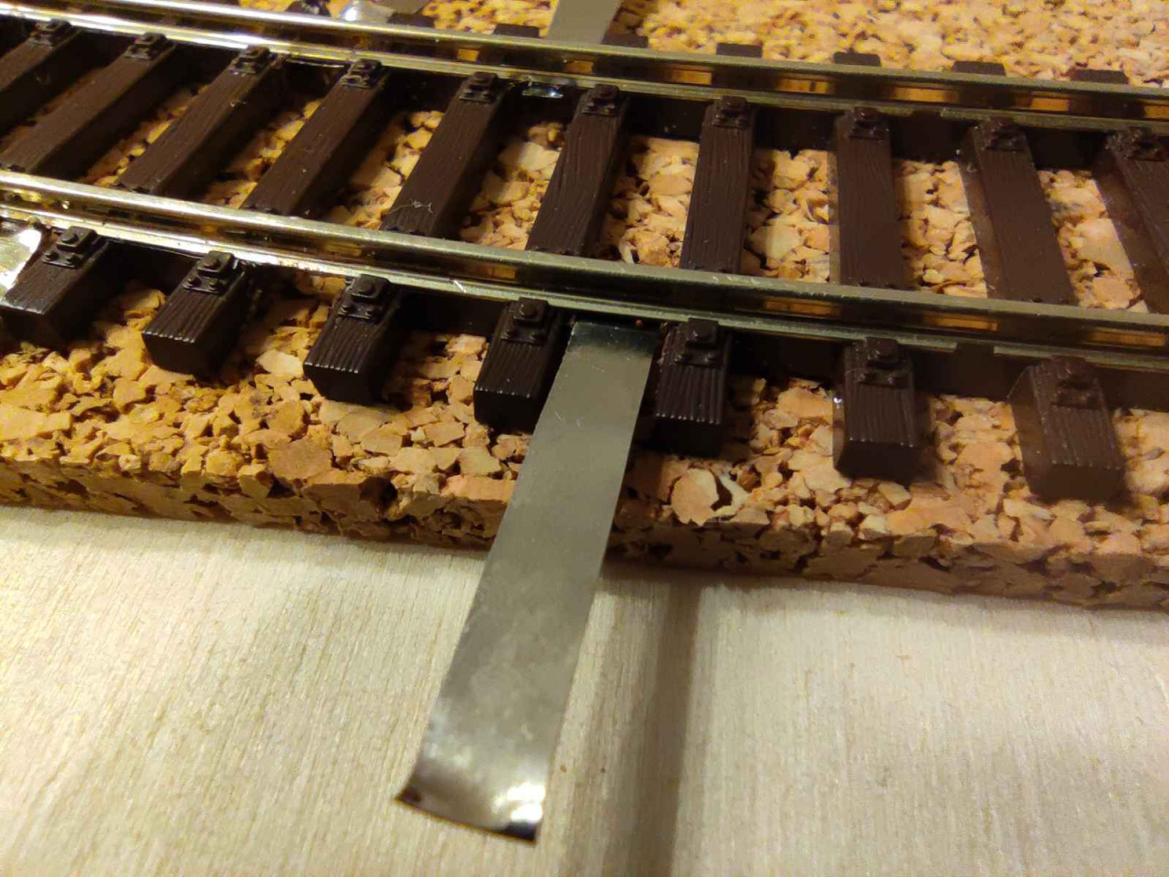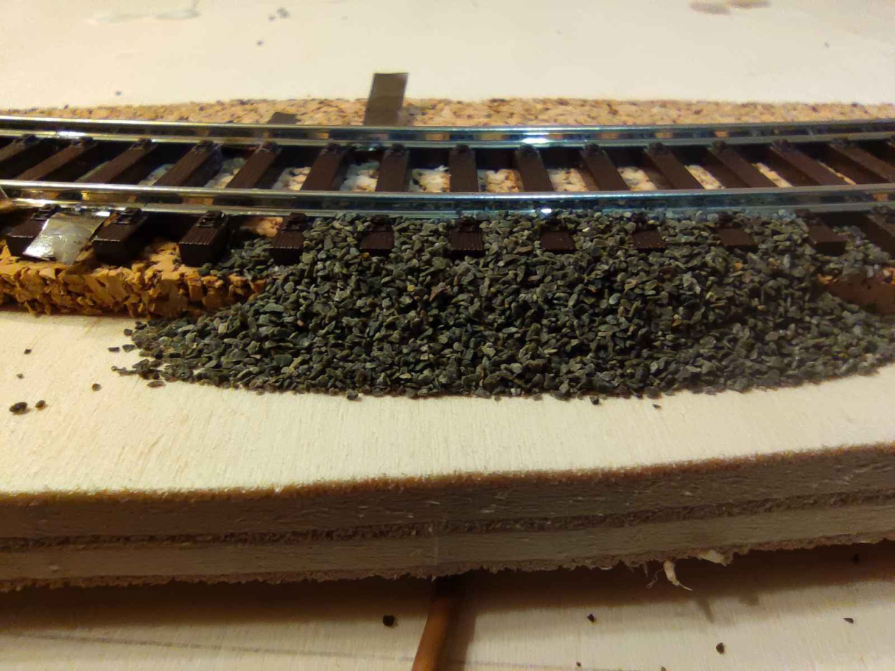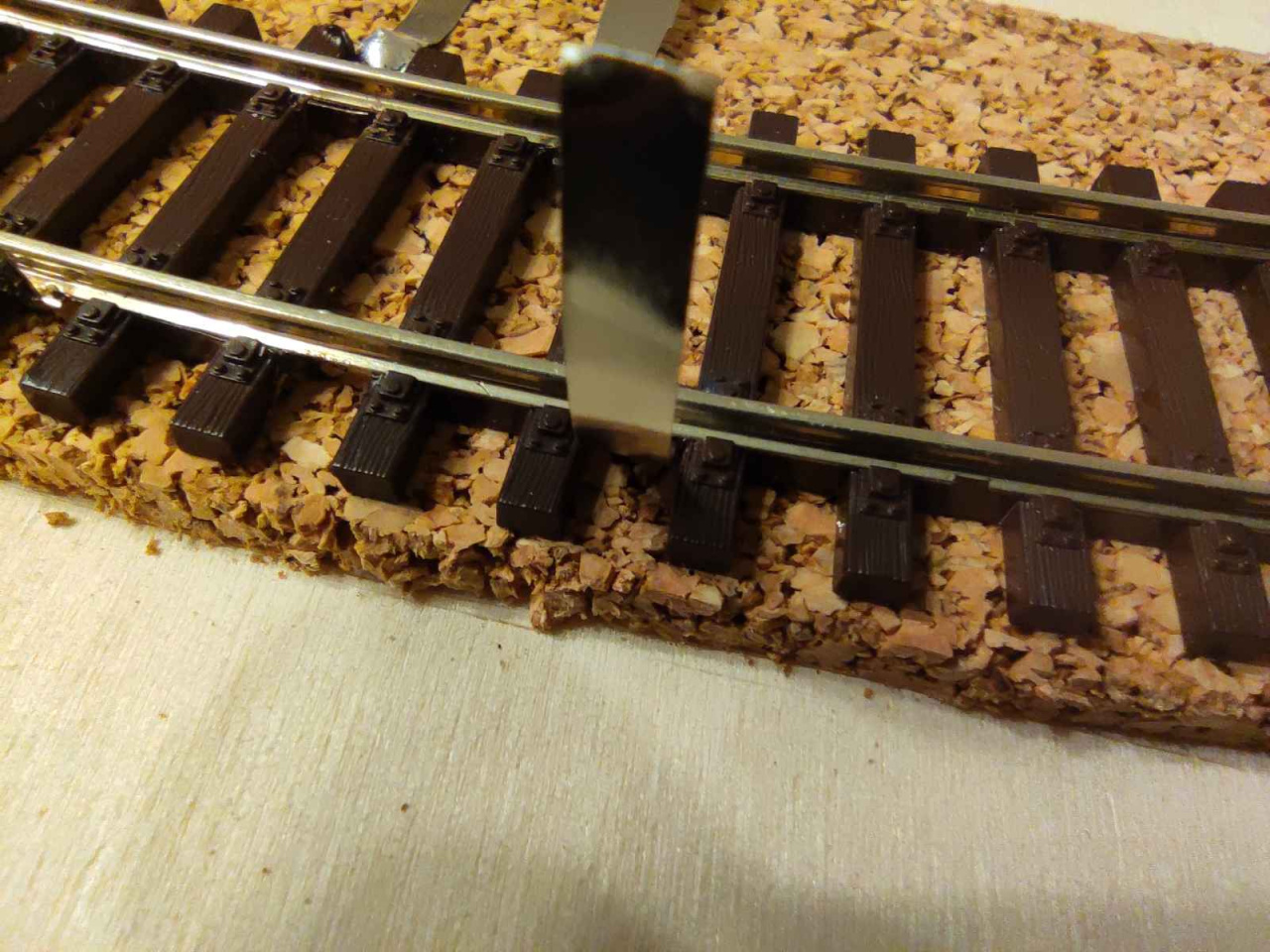 Nem. A síneket mi lefektettük a leragasztott parafára, és gombostűkkel rögzítettük. Utána az ágyazatot készítettük el, majd a szokásos módon ragasztottuk le: vízzel lespricceltük, majd higított faragasztóval (benne egy-két csepp mosogatószer, vagy folyékony szappan) becsepegtettük. Egy nap száradás után a gombostűket ki lehet szedni, a vágányzat stabilan a helyén van. Szükség esetén vizes szivaccsal benedvesítve az ágyazatot, a síneket roncsolás nélkül fel lehet szedni. Sajnos visszarakás után az ágyazatot újra el kell készíteni, de így nem roncsolódik, sérül a talpfarács.