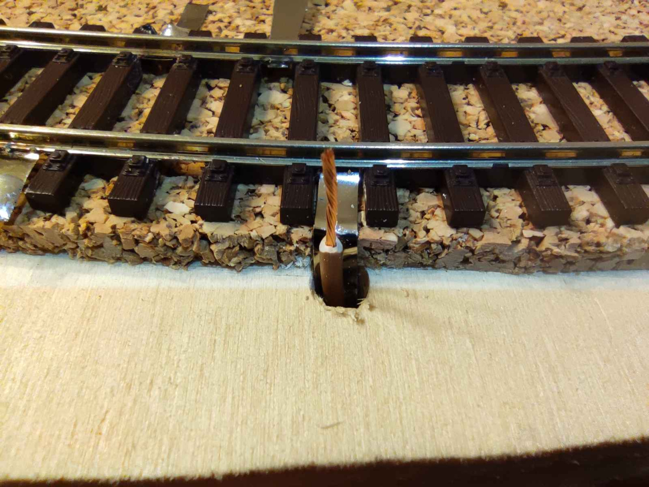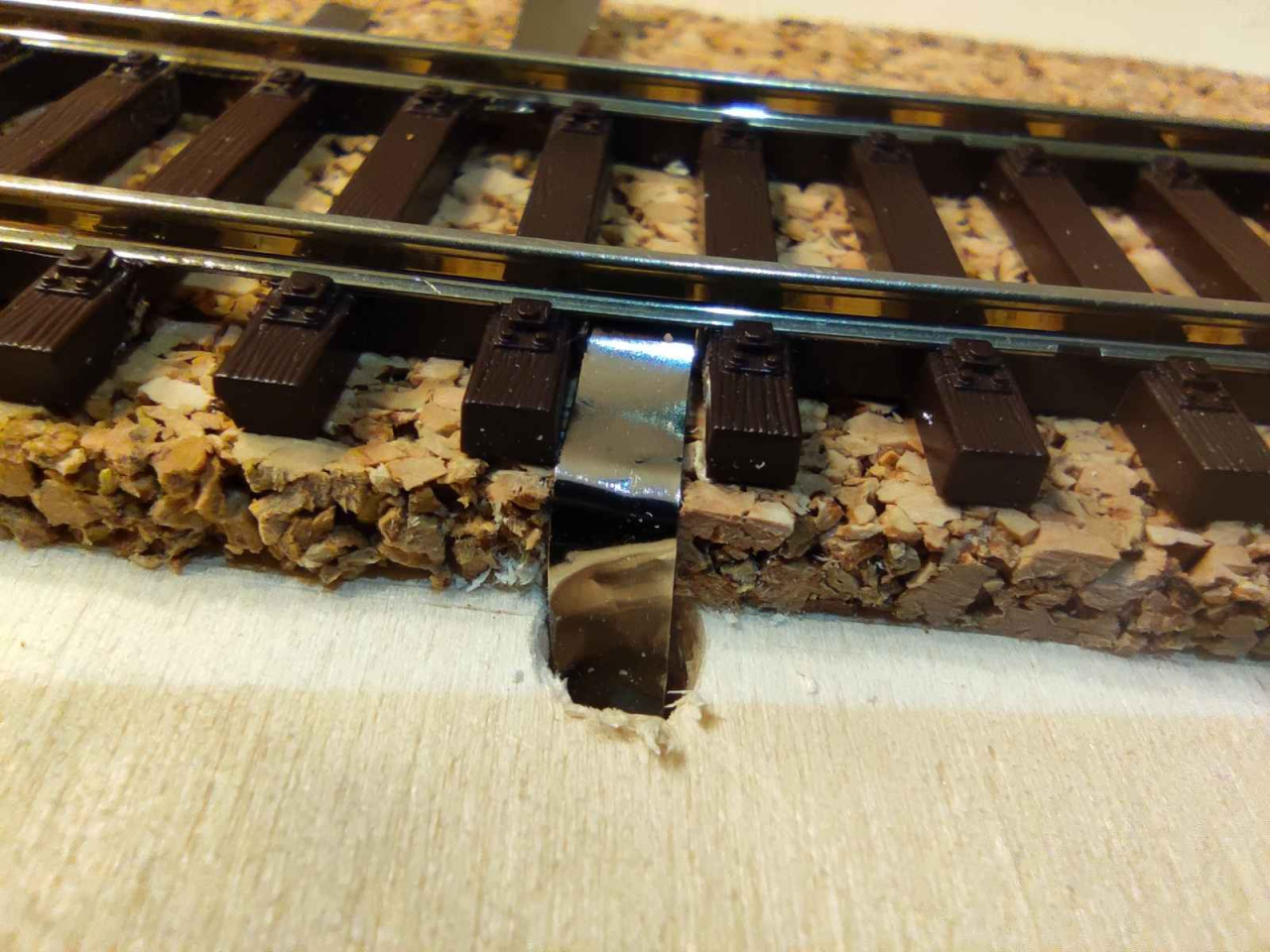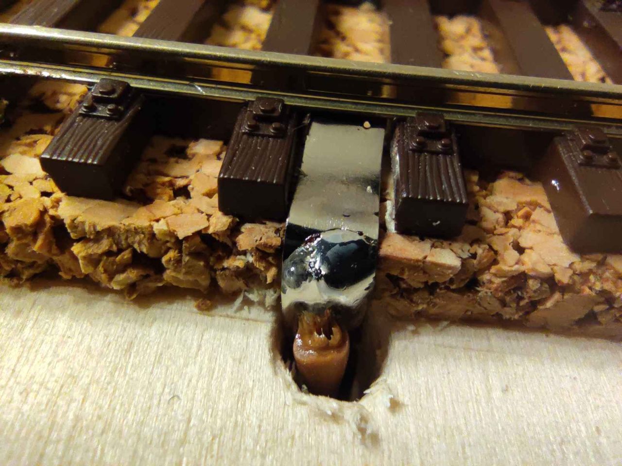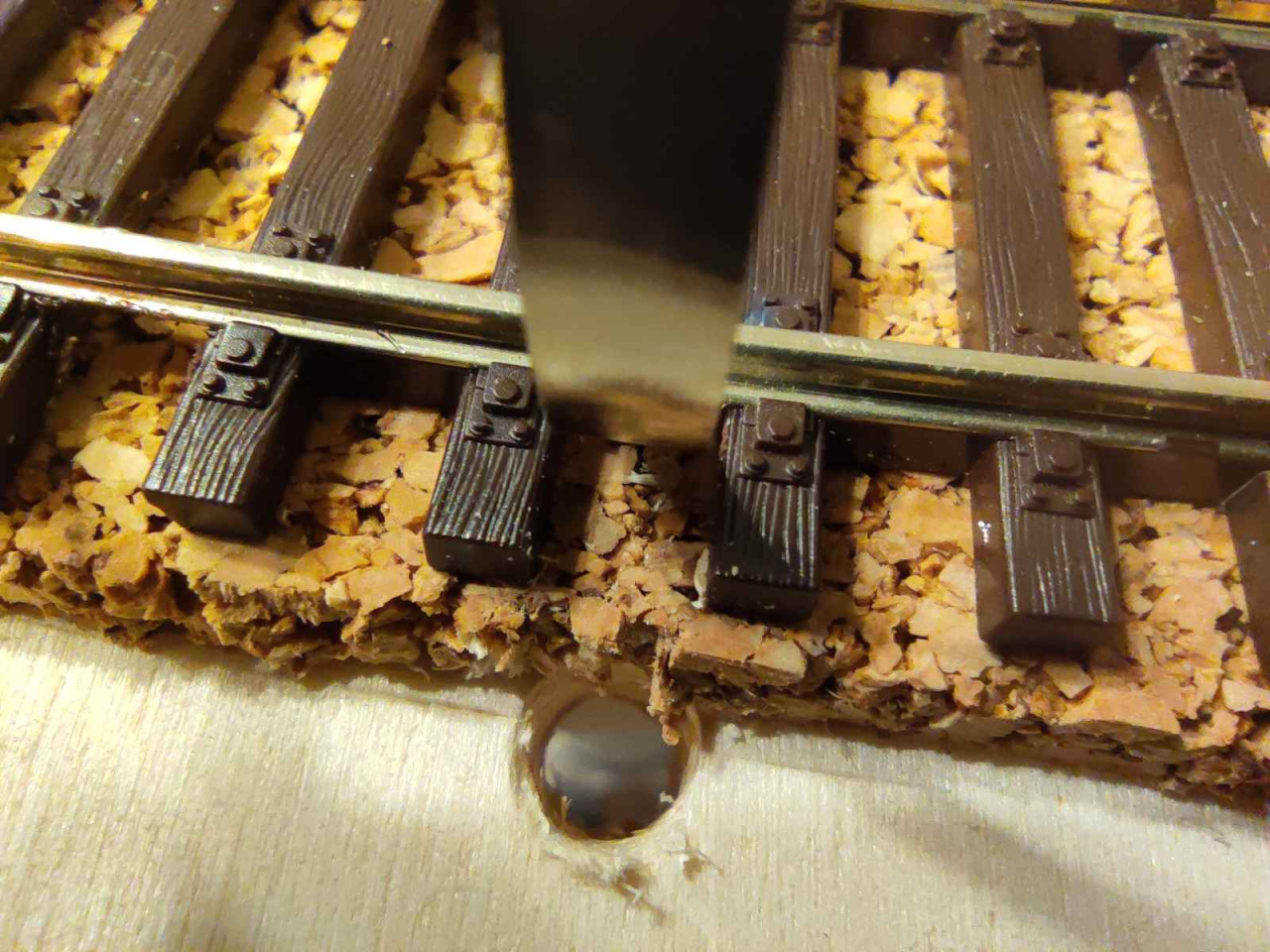 Idézet: „A sín lefektetés előtt a váltoknál a szervó 0.8-as pálcáknak ha fúrom a lukakat nem szaggatja szét a parafát a fúrószár?”