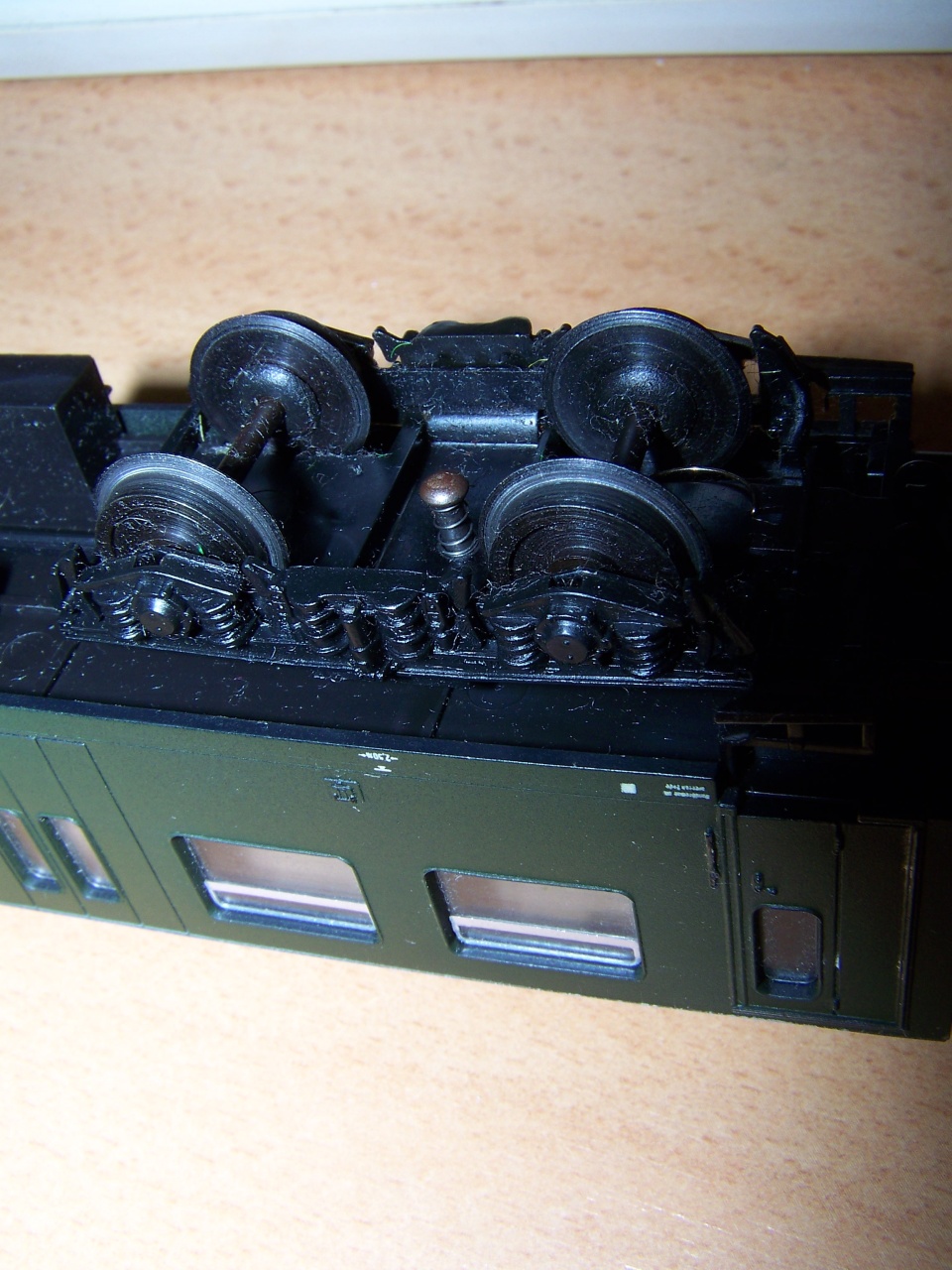 Leszedtem a 3. bütyköt teljesen, a másik kettőből is szedtem le, így lett egy kis függőleges játéka a forgóváznak. A csap lyukát is lekerekítettem, így tud rajta billenni, csavarodni. Betettem még egy rugót a forgóváz és az alváz közé. Tul.képen rugózik most mint az igazi. Elég erős persze a rugó, hogy ne essen lejjebb a vagon rugózós fele a fixebbik felénél. A másik oldalon csak a 3. bütyköt szedtem le, így az biztosítja hogy oldalra ne billegjen a vagon. De emelkedőre le/fel tud az a forgóváz is billenni. |