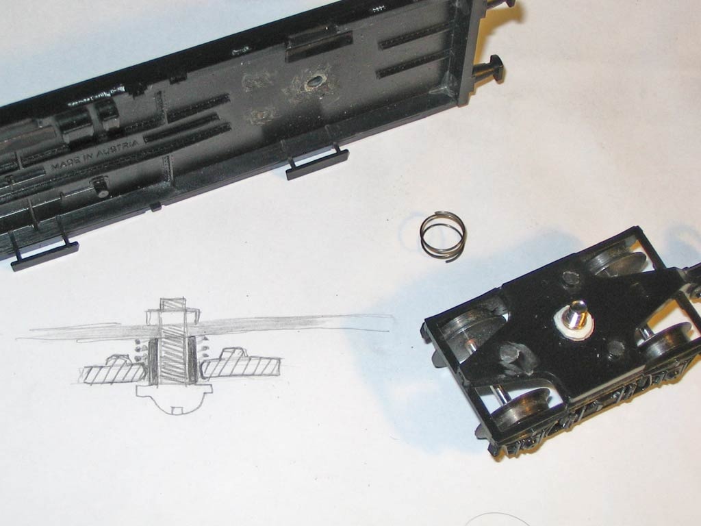 Szernitem mindenképpen le kell belőle majd csiszolnod. Megnéztem az egyik kocsimon úgy van, hogy a rögzítócsap feje és a forgóváz közé be van rakva egy rugó ami kb fél centis, az alváz és a forgóváz között pedig egy pár milis távtartó van ami gömb alakú.