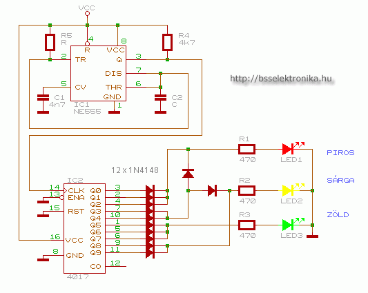 A váltás és a különböző időket egy 4017-es Johnson számlálóval és egy NE555-el lehet megoldani, ahol az idő egységeket diódázással lehet elkészíteni.