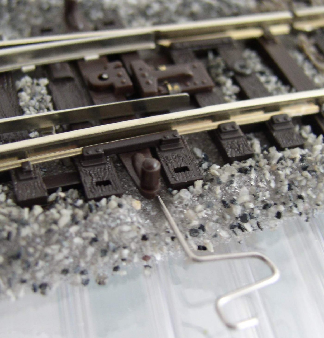 Viszont ahogy lerakom már kész is. Sőt lehet vele ívbe trükközni is: kis papírív csíkot alátéve a fél sín alá, ami nem látszik, szépen bedönti a pályaívet, minden "hókuszpókusz" nélkül....