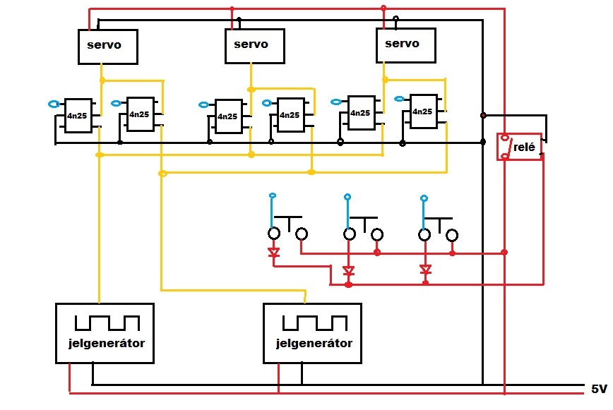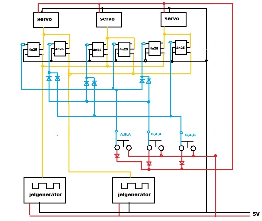 Továbbgondolva maradna a "központi" két jelgenerátor, és minden servo-hoz tartozna két opto kapu (a gombok helyett) ami kapcsolná a két jelalakot - innentől az opto-k bemenetét meg lehetne hajtani a diódás hálózattal.