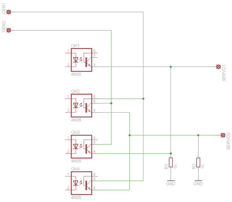 Az optokoplerek emmiterjeit akkor a földre kell kötni és a kollektor megy a szervora meg a felhuzo ellenállásra.