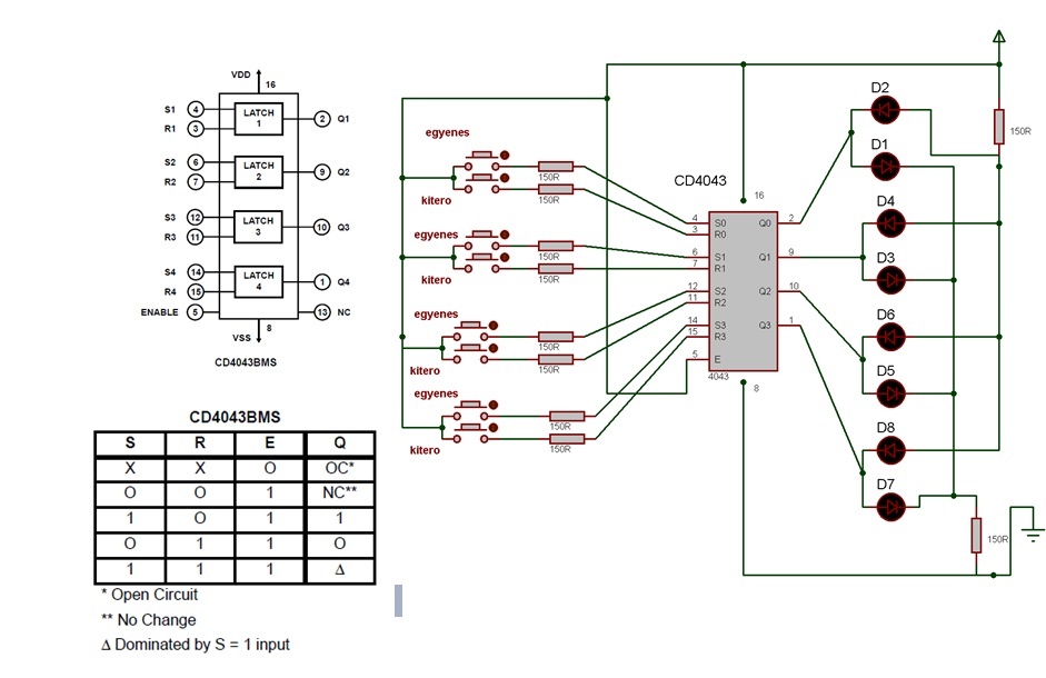 Egy pár magyarázatot kifelejtettem. A nyomógombok egyik felét a tápfeszültségre kötöd, a másik felét meg az IC egyik bemenetére és a váltó egyik bemenetére. Amikor az IC-n mondjuk az S0 bemenet logikai 1-est(tápfeszültséget kap), akkor A Q0 kimenet is logikai 1-es lesz, vagyis lesz rajta 14 volt. Ezzel meg tudsz hajtani egy diódát. Ha az R0 bemenet kap logikai 1-est, onnantól kezdve a Q kimenet logikai 0, vagyis a kimeneten 0 voltot kapsz ami szintén jó arra hogy meghajts vele egy diódát, és amint látszik minden kimeneten két dióda van, csak fordítva vannak bekötve és az egyik a földpotenciálhoz a másik pedig a tápfeszültséghez van kötve.