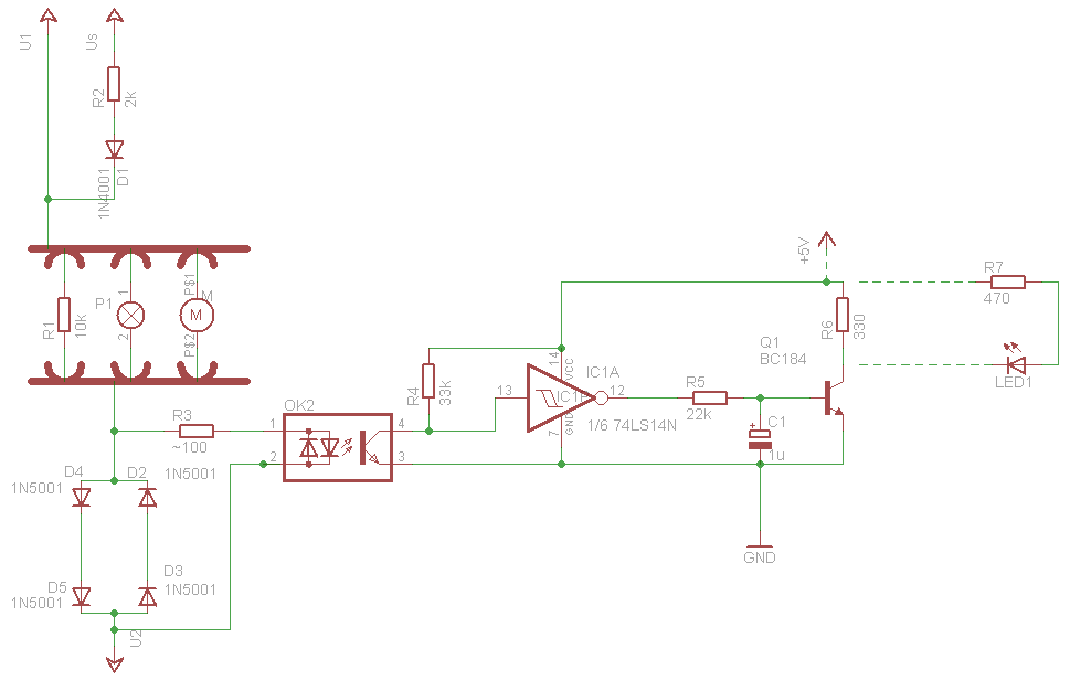 Ez a rajz jo az emlitett cikkböl. Egyetlen baja, hogy függ az optocsatolo érzékenységétöl, de 1,5V körül már minden optokopler szolgáltat valamilyen jelet. |
