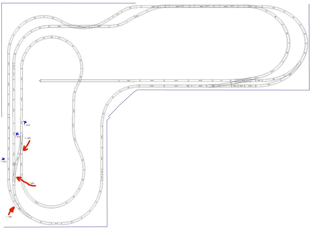 Mellékelek egy összevágott rajzot scarm részletekből Egybe sajnos nincs meg. Ott talán látszik az egész pálya. Remélem, hogy el is igazodtok rajt. A három jelzőt megjelöltem. Felkerült a harmadik is. Jelentem a középsőt is előrébb tettem.