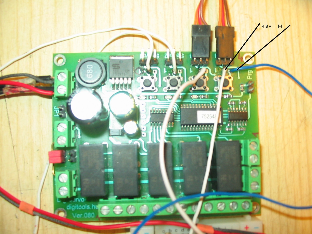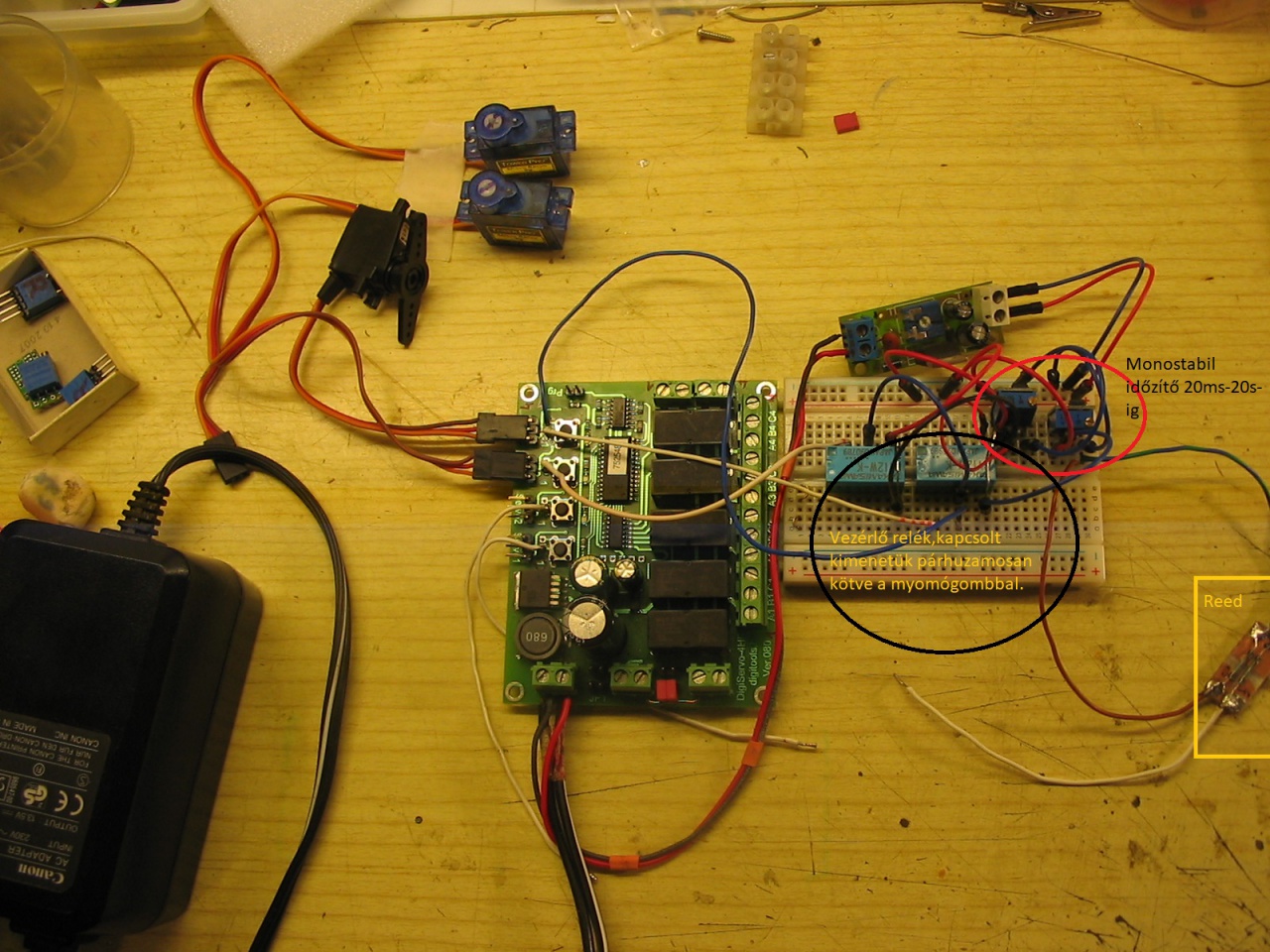 Jelenleg a gond az, hogy a nyomógombbal párhuzamosított Reed-relé a beavatkozó mágnes hatására nagyon bizonytalan impulzust ad, ami csak estlegesen működteti a szervót.