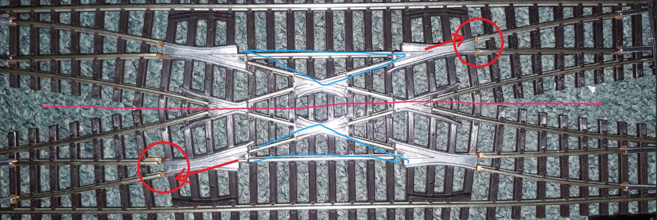 Sziasztok, na sikerült beszereznem egy hózentróger váltót, viszont sajnos az első képen pirosan jelölt két helyen kisiklik a mozdony és rövidre is zárja olyankor a rendszerem. Azt figyeltem meg, hogy a Piko Taurusom nem tud csak el menni ott jelenleg, mert nagyobb kereke van és hosszabb a két forgóváz távolsága mint a BR 218-as mozdonyé. A nyíllal jelölt irányba menve arra az oldalra ugrik ki, mert a karimája a keréknek pont a sínszál tetejére ugrik, amitől kivágódik a szélére. Erre milyen megoldás lehetne? A másik két szimmetrikus pontnál ez nem történik meg, illetve azok az ívek, olyan mintha nem lennének összekötve a pálya többi részével. (Sípolós műszer nem jelez vezetést szemben a többi sínszállal.) Azt a sínszálat picit lehet előre-hátra mozgatni, de ha túl közel rakom akkor vagy hozzáér a szigetelt szakaszhoz, vagy folyamatosan megüti a kereket. A két képen látszik, hogy miként jön le a pályáról a mozdony a bal alsó karikával jelölt helyen. Illetve lassú sebességnél egyik mozdony se akar keresztben menni nagyon, csak tempósabb esetben. Előre is köszi a tippeket  |