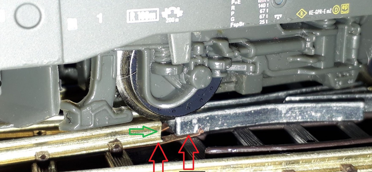 A hózi közepe, és a négy váltó különböző taplfarács magasságú.... tök jó nem? A váltók alá kell tenni valami vékony alátétanyagot (papír stb), hogy egy szintben legyen a közepével. (Két piros nyíl - látszik, hogy nem egy a magasságuk) A váltószívtől túl messze van a sín. Pici fogóval toligálható, vidd közelebb, a sínkoronát belül picit csiszolni kell (zöld nyíl). Csak ennyi.