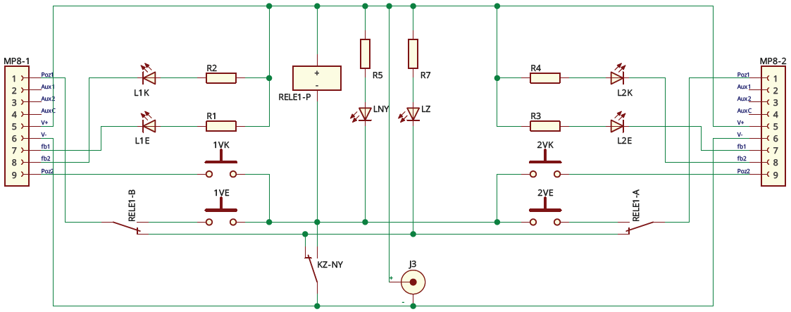 Működés: a kulcsos kapcsolót az áramkörön a Z-NY kapcsoló szimbolizálja. Alaphelyzetben a kulcsos kapcsoló a bal oldali érintkező felé zár, a ZARVA névre hallgató visszajelentő LED is jelzi a pulton. Ugyanebben az állásban a RELE nevű relé alapállásban van, a hozzá tartozó két áramkör pedig a kulcsos kapcsoló felől továbbít jelet az MTB gyártmányú MP8-as váltóhajtóművek Poz1 bemenetére, ennek jelentőségét alább részletezem. A kulcsot csak ebben az állásban lehet kivenni a kulcslyukból.