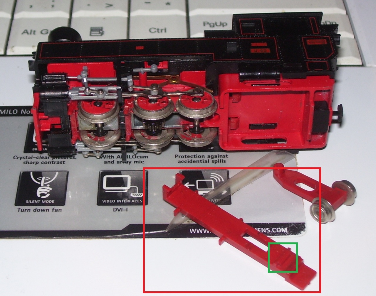 Áramszedők rendben, forgóvázak szabadon mozognak, kardán se feszül (van egy kis játéka) Szétszedtem, a kerekeket újra mostam alkohollal, és nagyon kevés kenést kaptak csak a tengelyek, a belső fogaskerekekre kentem még zsírt, így se tocsog, de már ellepi a fogakat, összeraktam, sokkal jobb lett, de egyik irányba kanyarban még mindig egy picit csikorog-nyikorog, bár tény, hogy sokkal szebb hangja van. Kentem a forgóváz forgópontját is.