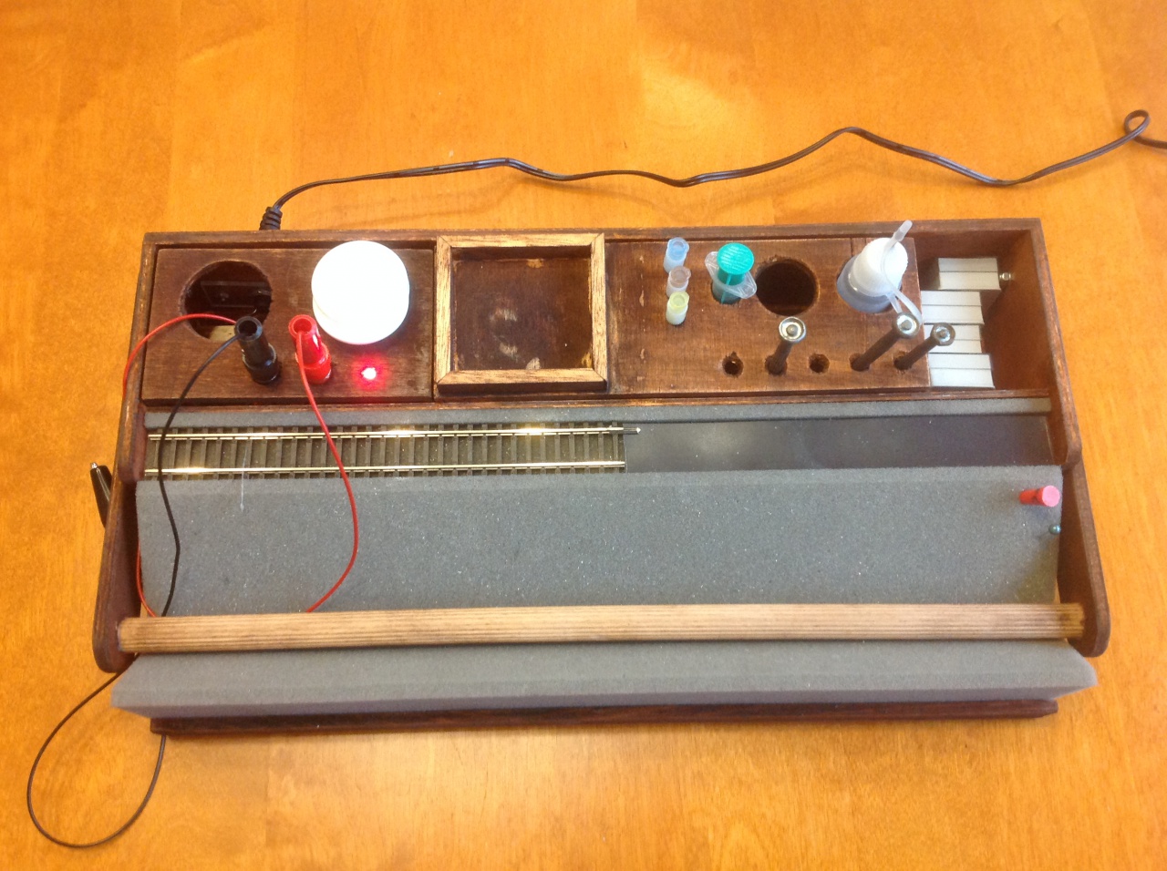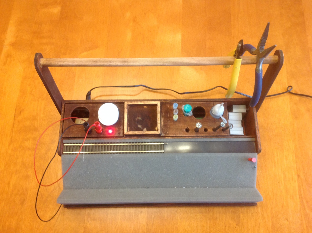 Miután lassan elkészül a terepasztalom, fel kell számolni az átmeneti mühelyt a helységböl, hogy legyen hely a vendégeknek meg a szoba is jol nézzen ki. A jármüvek karbantartása azonban továbbra is szerves tartozéka a terepasztalnak igy csináltam egy kis "hordozhato mühelyt" ami elfér egy fiokban és ha kell pillanatok alatt bevethetö. A képen láthato hogy megvan a helye a jármünek, egy darab sin is van hozzá, a pultban van egy áramforrás ( 12 V dugasztáp) mindenféle tégelyek zsirnak, olajnak, apro kéziszerszámoknak a felhajthato fogantyura a fogok akaszthatok fel. A pultban van elég hely kisebb nagyobb dobozoknak apro alkatrészekre - tapadogyürük, apro csavarok, motorkefék, rugok stb. Majd meglátom mennyire válik majd be. Az egyes egységek kivehetök, igy esetleg majd cserélhetök, kiegészithetök. Lehet, hogy még egy amperméröt is épitek a pultba, hogy mérni tudjam a modellek áramfelvételét. |