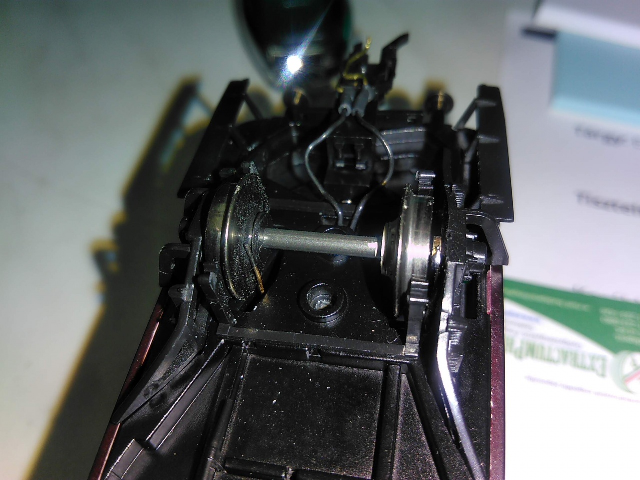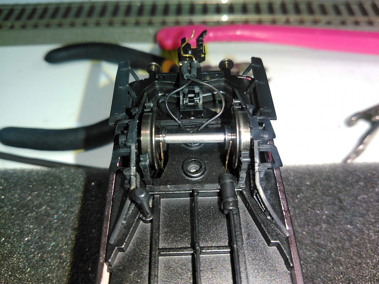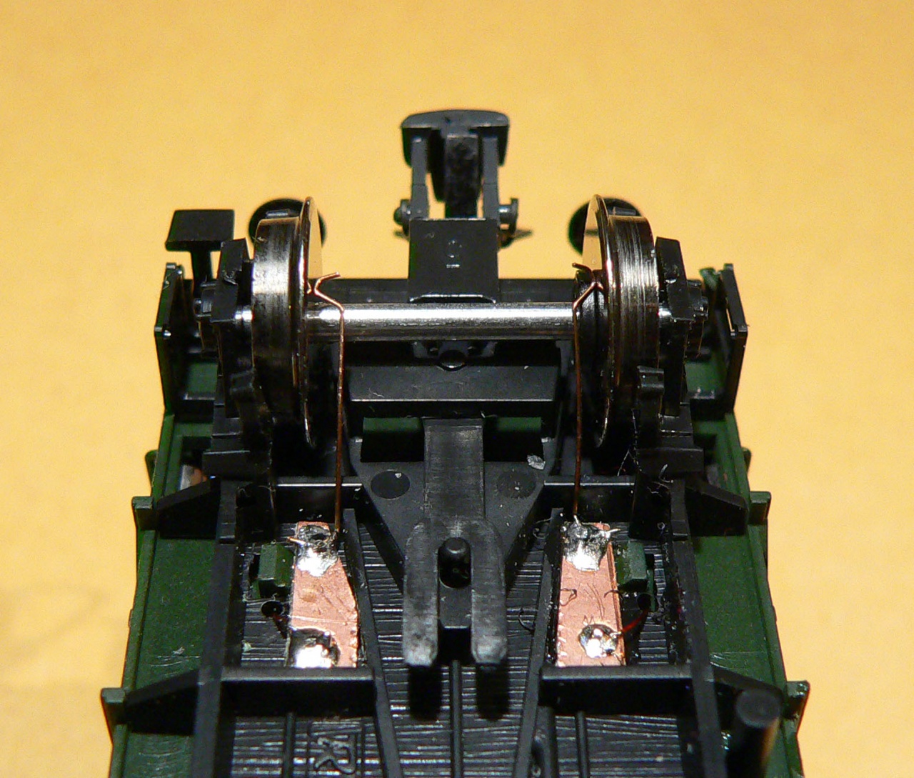 A Tillig gondolkodott - egy picit, de megtette - van egy kéttengelyes kocsija, aminek a négy kerekével eléggé bizonytalan az áramszedése ahhoz, hogy csak két ponton tegye ezt meg. Ha a kerékről szednék az áramot, akkor folyamatosan "behúzott kézifékkel" kínlódna a kocsi a pályán, és vele a mozdony is. Így megtették legalább azt, hogy a tengely közelébe vitték az áramszedést, és megpróbálták a kényszerű súrlódást úgy is csökkenteni, hogy nem egy lemez lamellát nyomtak oda, hanem egy réz, vagy bronz drótot. Sajnos ez a drót a levegőn alanyi jogon oxidálódik, vagy veszít a vezetőképességéből a felületén, ami érintkezik a kerékkel. Ezt kell lepucolni, és helyrejön a dolog.