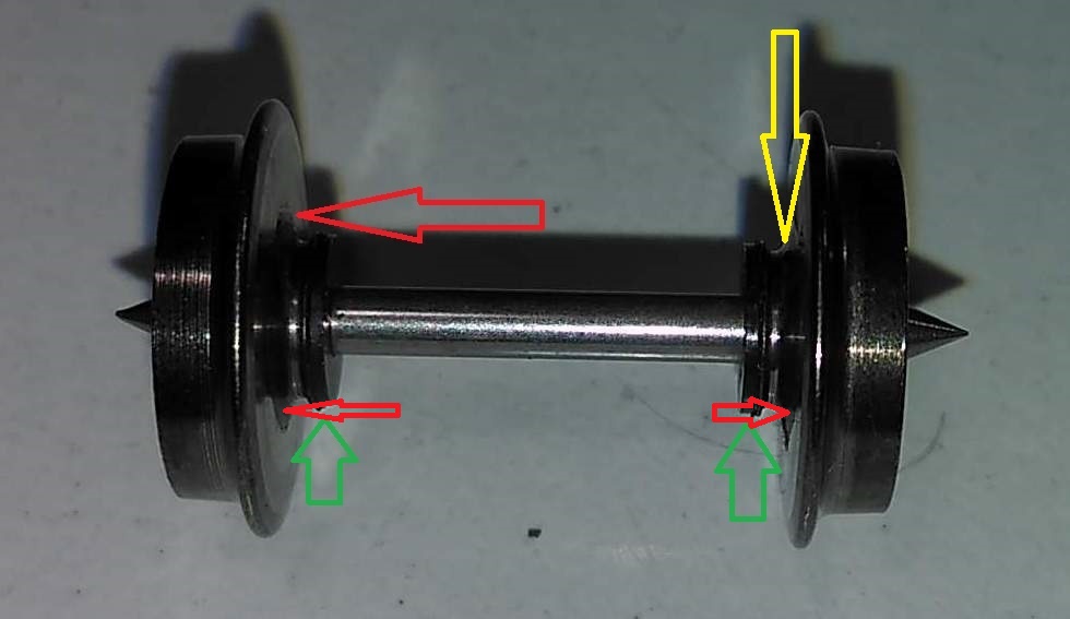 Azokon a kerekeken van a belső oldalukon egy-egy "vályú", abba kell belesimulnia az áramszedést végző bronz, vagy réz drótnak. |