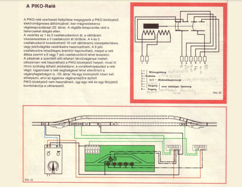 ( a zöld vezetékek nem a nyomogombokhiz mennek ( vagy oda is) hanem a elsö meg a második sinkontaktushoz. Az elsö a jelzö után vörösre vált, a másik meg a szakasz végén zöldre.