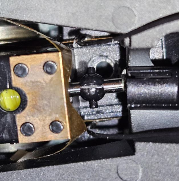 A képen egy ROCO BR01-s látható, konkrétan a 63340 cikkszámú modell mozdonyának az a része, ahol a szerkocsiból átnyúló kardánt fogadja a hajtás. A hibajelenség az, hogy a csatlórudazat akadozik a mozdony futása közben. Az oka a képen látható, ugyanaz a kardánfogadó "bütyök" acéltengelyen, réz csigával, mint a BR101 modellben. És ugyanúgy el van repedve, elforog a tengelyen, nem képes megfelelő nyomatékot átvinni a kerekekre. |