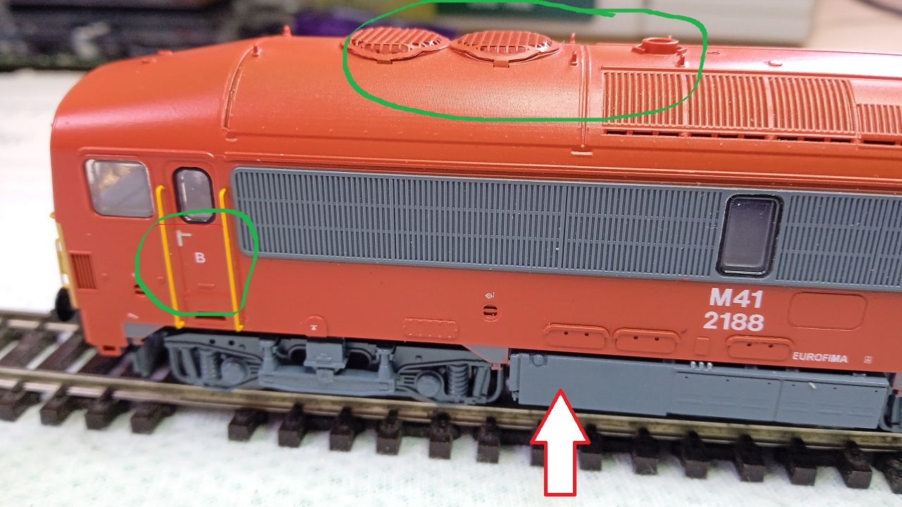Az M41 mozdonynak az 1-es vezetőállása, vagy "A" vezetőállása az azon a végén van, amit a képen az alvázon nyillal jelöltem. Ez eddig jó is. A kaszni is jól van festve, az "A" vezetőállás a ventillátorokkal ellentétes oldalon van. Csakhogy a kaszni meg nem megy fel az alvázra, csak a képen jelölt módon. Vagyis az alváz az DCC üzemben jó irányba meg, és világít, de a kaszni ehhez képest meg fordítva van.
