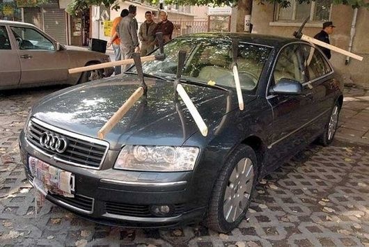 Ó, én simán megoldanám: Egy villás targonca emelővilláit dugnám át az ablakain. Ja, hogy fel voltak húzva? Hát bocsika, így jártál, izomagyú! Ja, hogy "véletlenül" a villák leengedése során egy "pöttyet" a kelleténél lejjebb engedta a targoncakezelő a villákat? Ettől az ajtók enyhe "formatrvezést" szenvedtek el? Hoppácska! Talán legközelebb nem itt parkolsz majd, nyakatlan bőrhaj! |