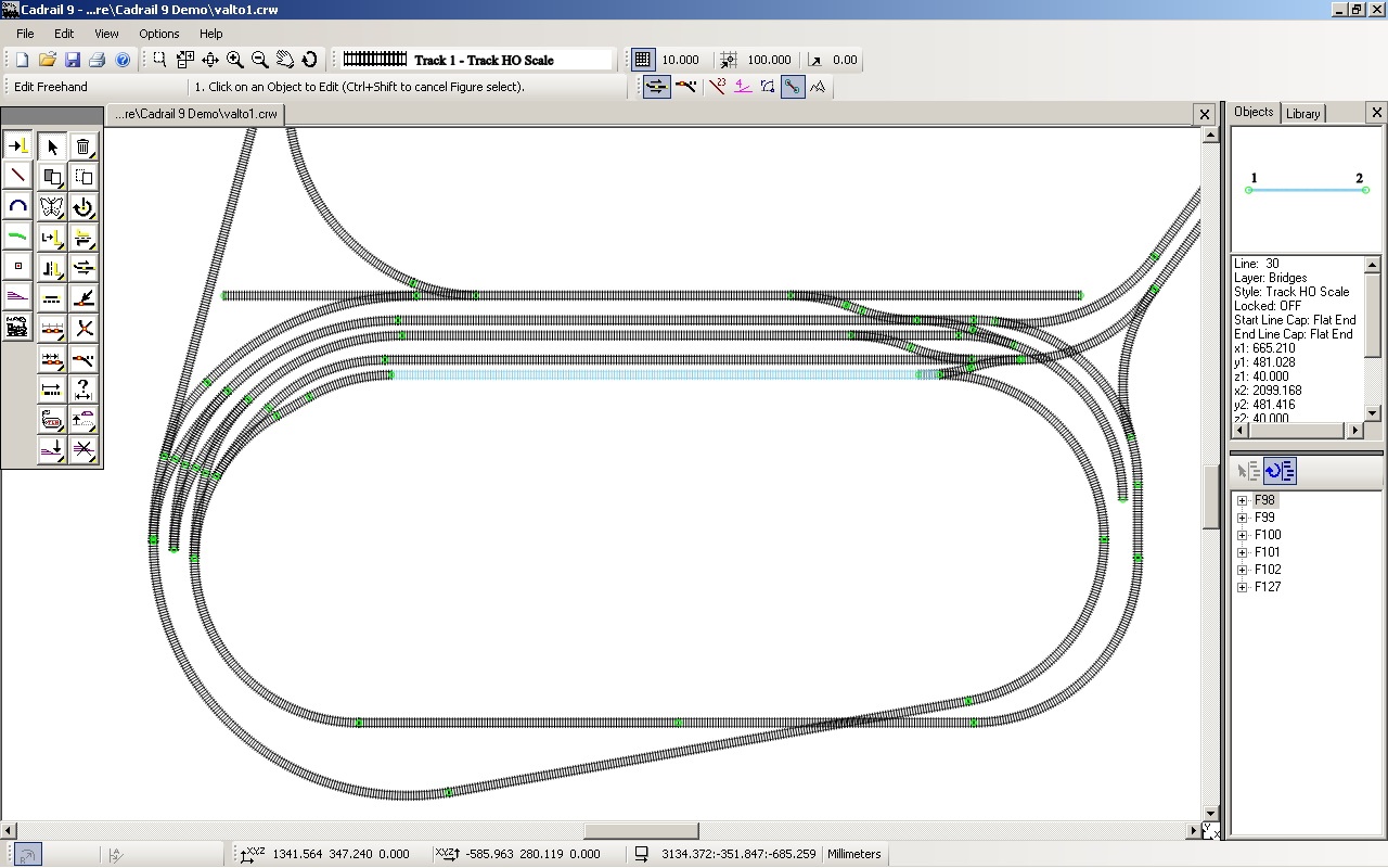 options/3D view, és akkor ő elkészíti a modellt egy külön kis ablakban, amiben aztán tudod forgatni. Hidakat a sínekhez úgy tudsz bejelölni, hogy layert váltasz, a layerrel együtt pedig sínt.