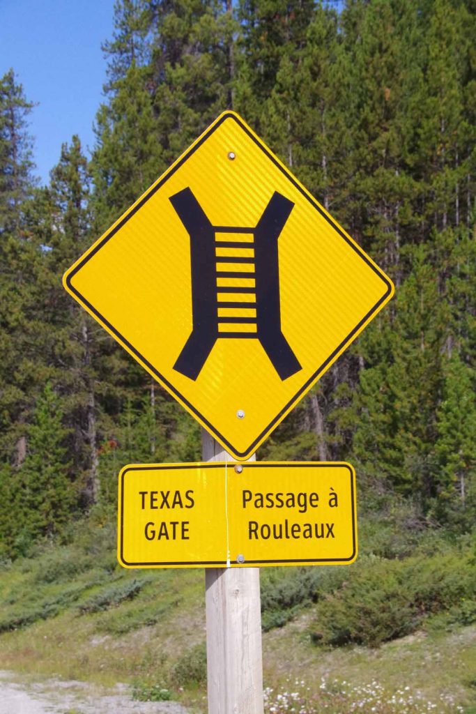 Ennek a kanadai megfelelője egy sárga, élére állított négyzet, benne a felirattal: "TEXAS GATE". Eleinte csak lestem, hogy hogyan kerül ide Texas, és miféle kapuja van itt, mígnem felvilágosítottak, hogy ez egy olyan, rácsos-görgős, az útba épített rész, ami megakadályozza hogy a tehenek - és más állatok - kikószáljanak a farmról.