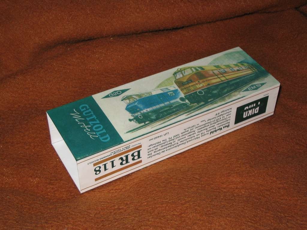 Nem teljesen jármű építés, de mégiscsak saját kreálmány amit mutatok most. Régi Gützold BR118 -asomhoz nem volt dobozom, ezért csináltam egyet magamnak. Egy segítőkész modellező segített, beszkennelte az eredeti dobozt. Ezután álltam neki Photoshoppal felújítani a grafikát és a szövegeket. Sikerült megtalálnom az eredeti betűtípusokat is amiket a dobozon használtak. A doboz 1.3mm -es kartonból készült. Oldalak kivágása után 45 fokban letörtem a papír élét dremel csiszolóval, majd Palma fa-ragasztóval összeragasztottam a dobozt. Olyan erős lett, mintha fából lenne, nagyon merev. Ezután kinyomtattam színes papírra a feljavított képeket. Első verzióban először lefóliáztam matt fóliával, majd faragasztóval felragasztottam. De ez nem lett szép, a fa ragasztó átjött a papíron, elmosta a tintát, kifehéredett foltos lett. A 2. kísérlet sikerrel járt: a kinyomtatott papírt ezúttal trinát lakkal "ragasztottam" fel a meghámozott dobozra. Ebben ugyanis nincs víz, nem lesz ráncos tőle a papír, nem oldja ki a tintát. A lakkot szivacshengerrel vittem fel. Majd száradás után kívülről is kapott egy lakk réteget. Szintén szivacs hengerrel. Ez azért jó mert nagyon egyenletes, majdnem olyan mintha fújva lett volna. És nem hullik, ragad bele a szőre a lakkba