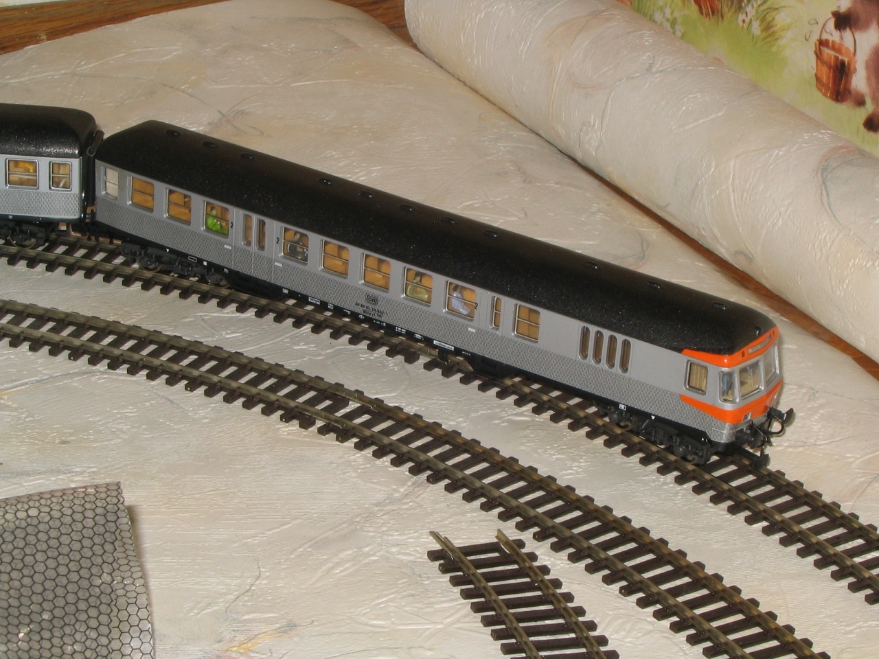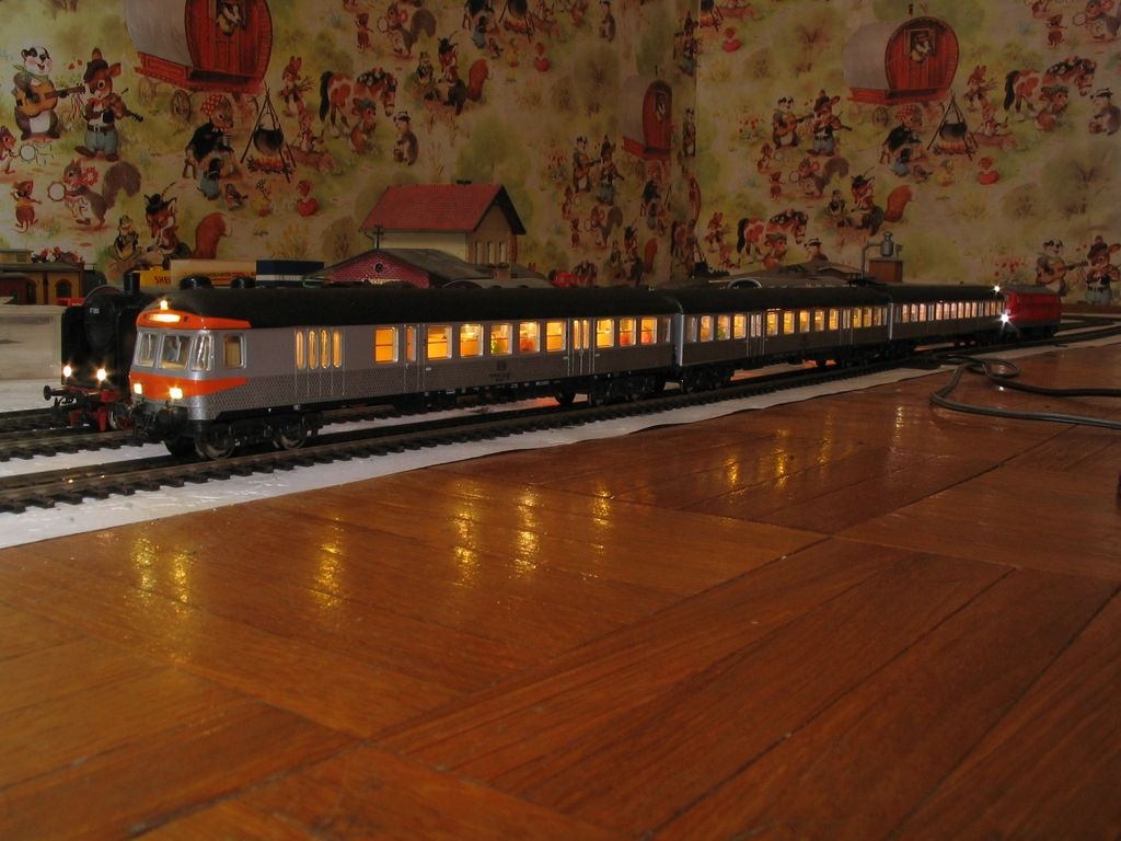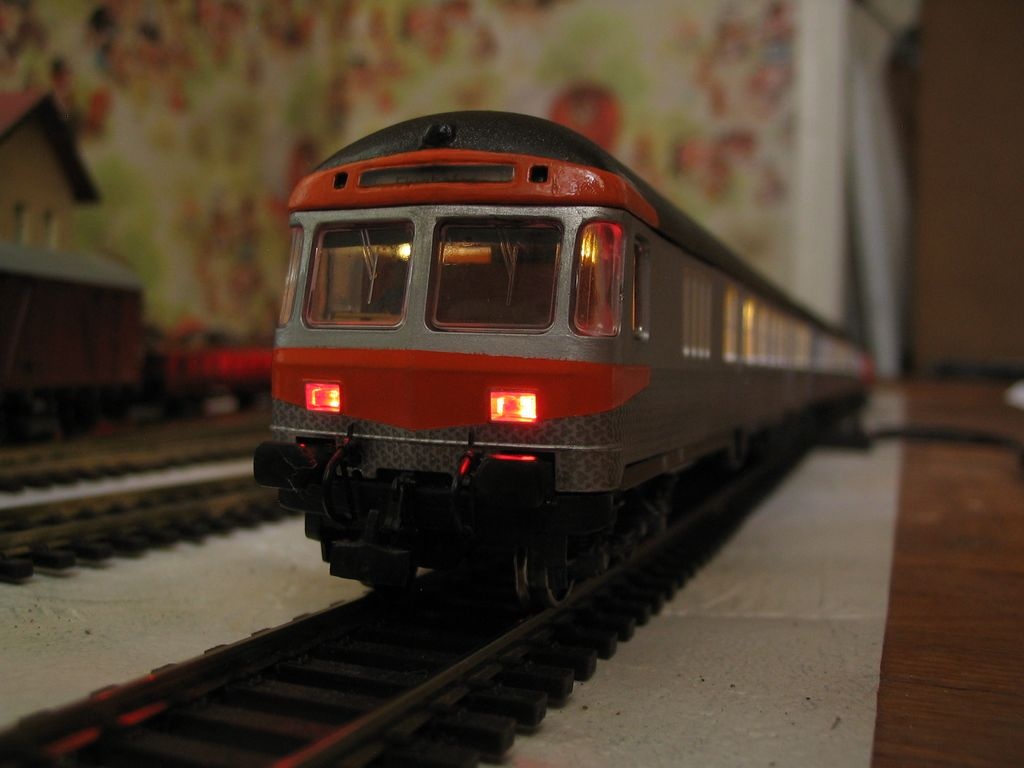A tetőt és a sárga csíkot Bátyám fényezte újra, én meg elektronikát raktam bele, szokásos saját készítésű dekóder szünetmentes áramforrással. Rá lehet programozni a vontató jármű címére, így ha az irányt vált, a vezérlő kocsin is megtörténik a fényváltás. Jah, és kapott még új kerekeket , és utasokat is.