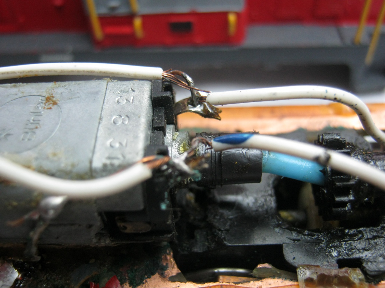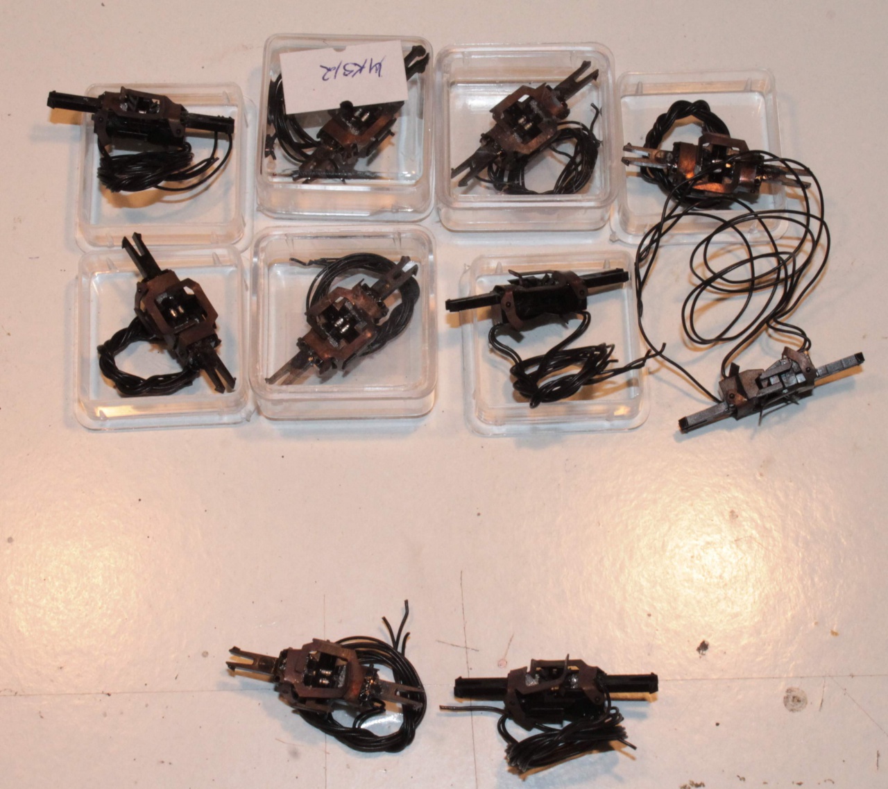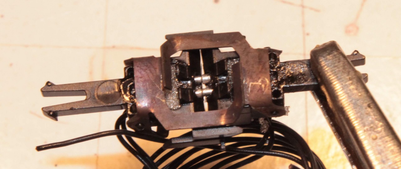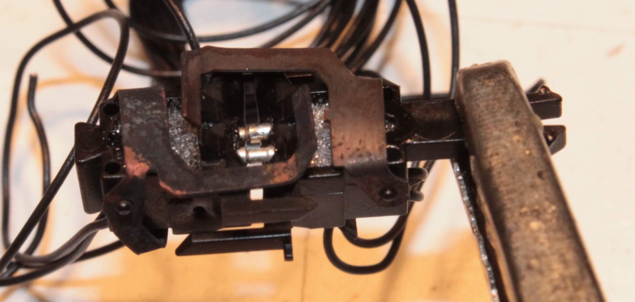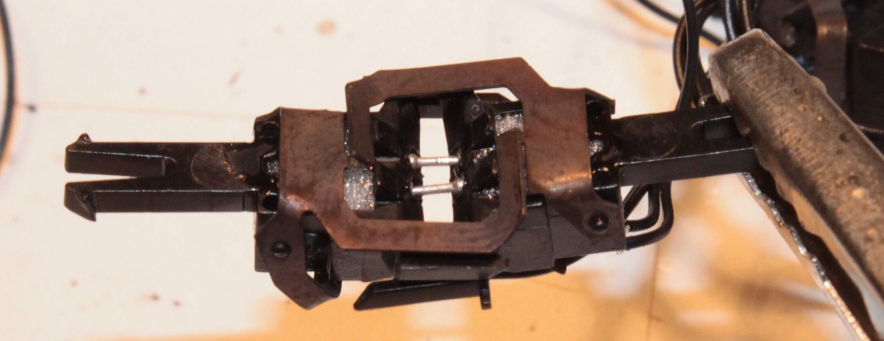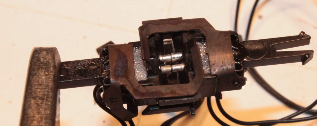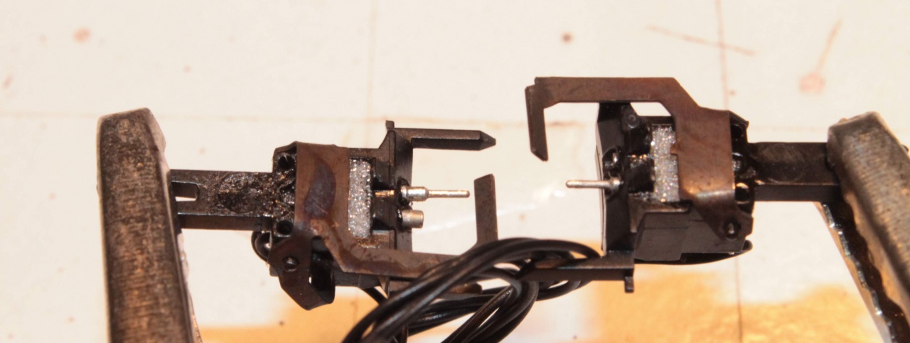 Ez idáig rendben is van, de tudnak "lötyögni". Azaz ha össze vannak nyomva az érintkezők - azaz rendesen viszi az áramot - akkor az akasztók lötyögnek, mert távolabbra akasztanának. Ha valami miatt az érintkezők széjjelebb csúsznak, akkor az akasztók megfogják a kapcsolókat, azaz nem csúszik szét a szerelvény, de ekkor már az áramátadó érintkezők lötyögnek, azaz nem tökéletes a kapcsolat, ami látszik azonnal.
