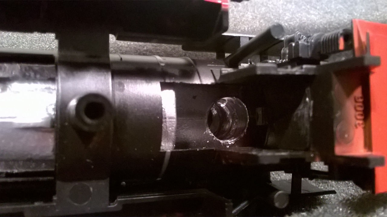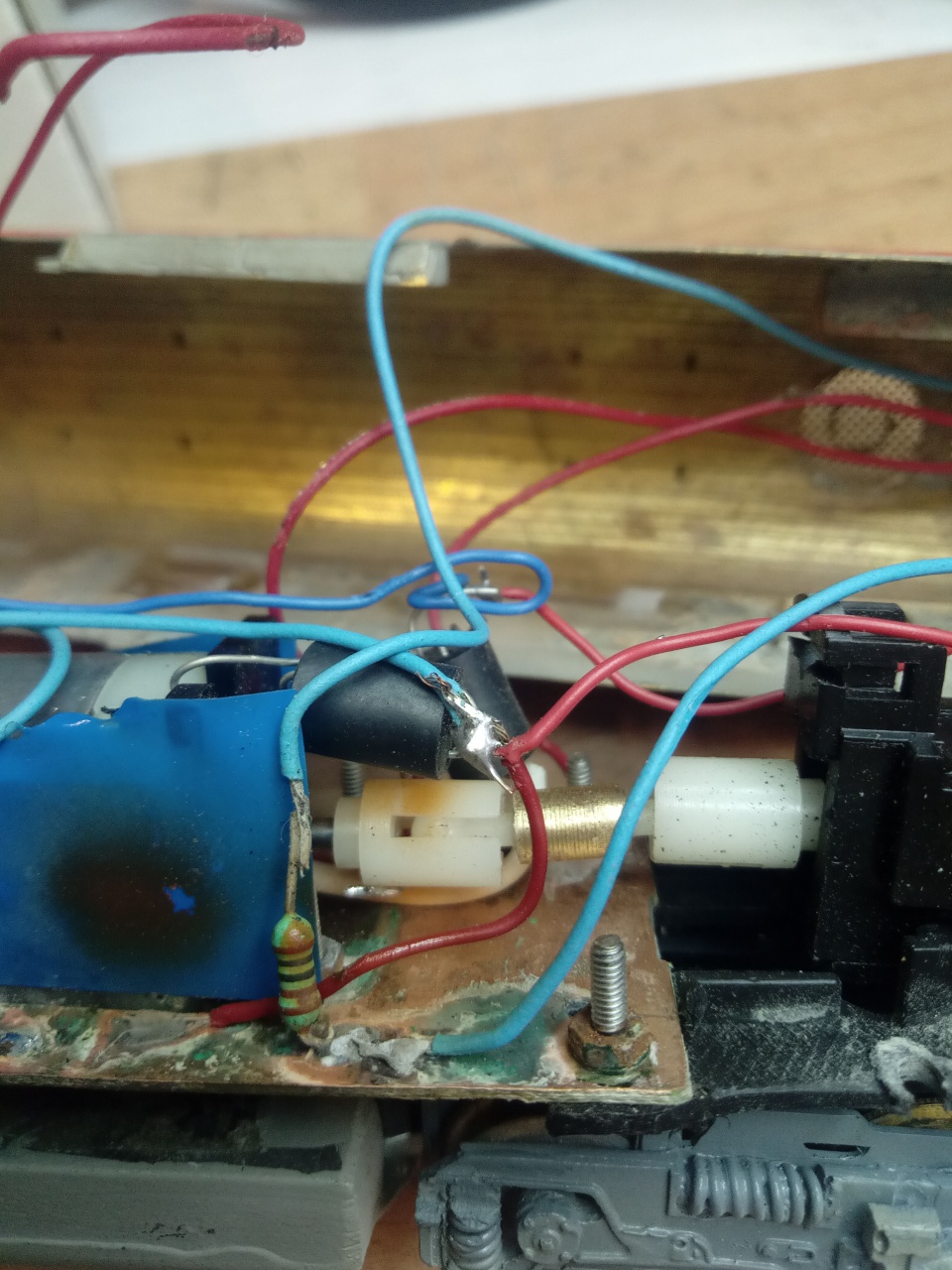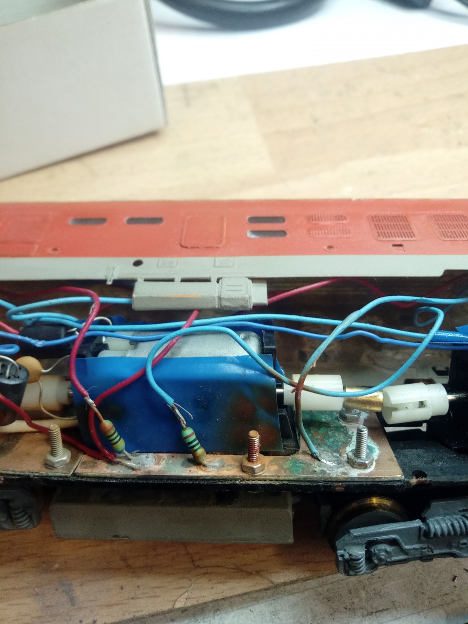 Szóval, ez egy Mehano alapra épített M63-as, miért pénzt kértek. Ott kezdődött a dolog, hogy a modell tele volt reszelékkel, ezt ki kellett takarítani. A képen látható un. "forrasztásoktól" füstölt el bennem a biztosíték igazából. Annyira telekenték valami savas adalékkal, hogy a réz szabályosan rohadt benne, és még a horganyzott M2-es csavar is rozsdás a közelében tőle. A csimbókos forrasztóón kupac is "meseszép" látvány a vezetékeken. A világítás digitális üzemhez hasznavehetetlen, mert a LED-ket úgy kötötték be, hogy azok végzik az irányváltást, vagyis hátrafelé a fehér LED-ken rajta van a vontatási feszültség, csak záróirányban. Természetesen a LED-k úgy vannak "beépítve", hogy kiszedésük, és helyes bekötésük roncsolás nélkül lehetetlen. A forgóváz maszkok meg úgy lettek "rögzítve", hogy csak a szentlélek tartja őket a helyükön, mert az eredeti- egyébként teljesen hibátlan megoldást - átalakították, mert valamiért nem volt jó. Nem sorolom tovább, csak még egyet: azért arra illene figyelni, hogy a festés után a lakkozást olyan lakkal csináljuk meg, aminek az oldószere lehetőleg azonos, vagy hasonlít legalább a festékére, és viszont. Így ugyanis a lakk nem köt meg soha, ragad a kaszni...