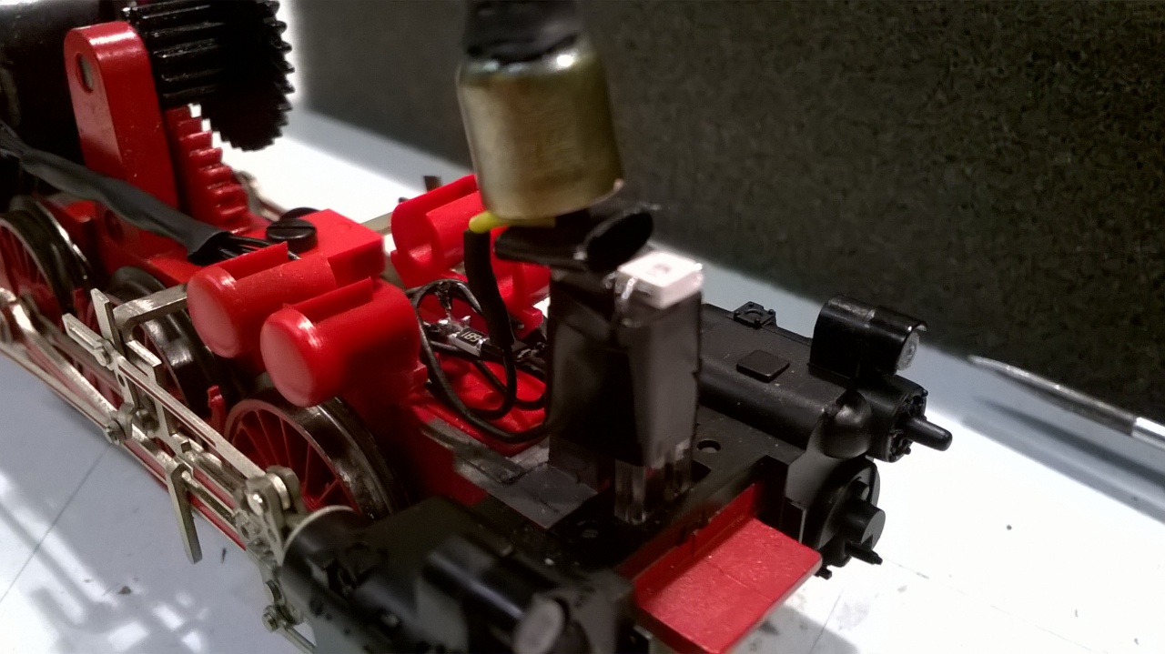 Kapott két SMD led-et (egyik felfelé, másik lefelé világít), plusz a védődiódát, meg az ellenállást. Ezzel megoldódott az allosztérikus gátlás, a csúcsfény is világít (Spiztenlight), és még füstöl is a mozdonyka.