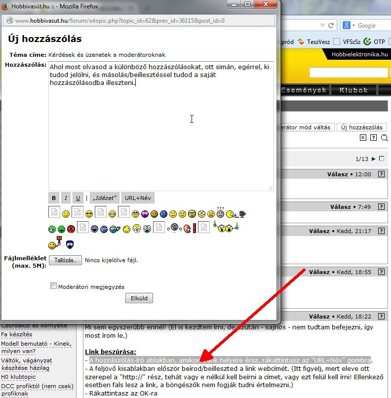 - A hozzászólás-író ablakban, amikor a link helyére érsz, rákattintasz az "URL+Név" gombra.