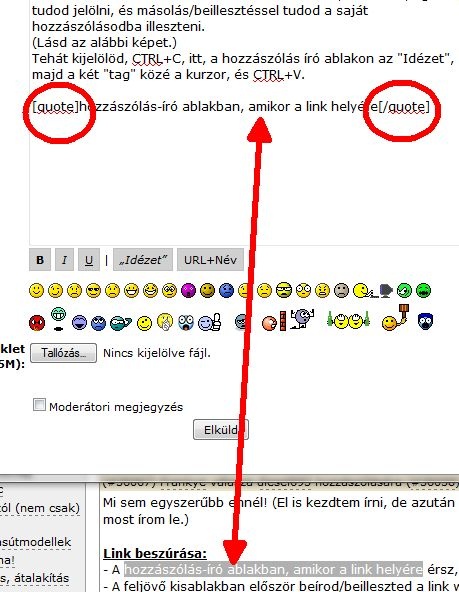 Tehát kijelölöd, CTRL+C, itt, a hozzászólás író ablakon az "Idézet", majd a két "tag" közé a kurzor, és CTRL+V.
