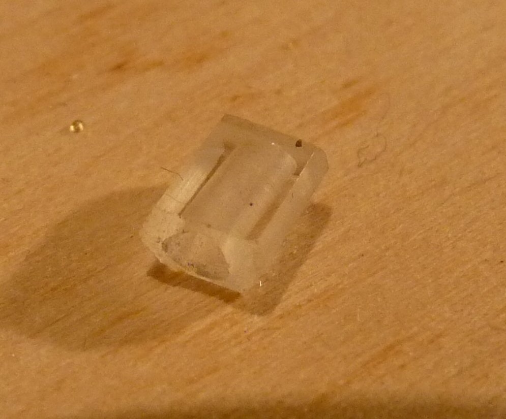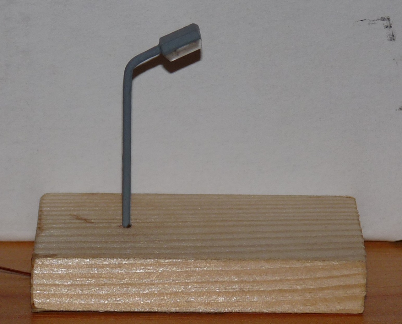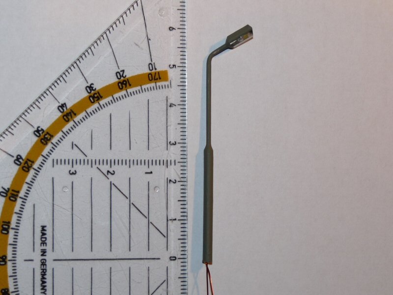 A tű egy injekciós tű 1,27mm külső átmérővel 0,8 belsővel. ebbe simán belefért két szál lakkozott rézhuzal (tekercshuzal) 0,35-ös átmérővel. Beleférne három is, ezért nem akartam bajlódni a rozsdamentes tű forrasztásával, meg így a ledet is könnyebb a két vezetékre forrasztani.(1-es kép). A hajlítás egyenlőre két laposfogóval történt gázláng fölött úgy, hogy a tűbe befűztem egy 0,7 es vasdrótot. Kicsit nehéz volt kicibálni hajlítás után, de sikerült. Ha elkezdem a sorozatgyártást akkor persze kitalálok valamilyen hajlítót, hogy egyformára sikerüljenek. A képen pedig maga a lámpatest látható 3mm-es plexiből kialakítva. 2,5-ös fúróval hosszirányú zsákfurat fúrva, ebbe toltam bele a ledet az oszloppal együtt és Uverapid 5-tel tömören beragasztottam (kiöntöttem). |