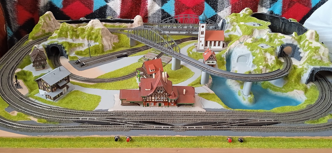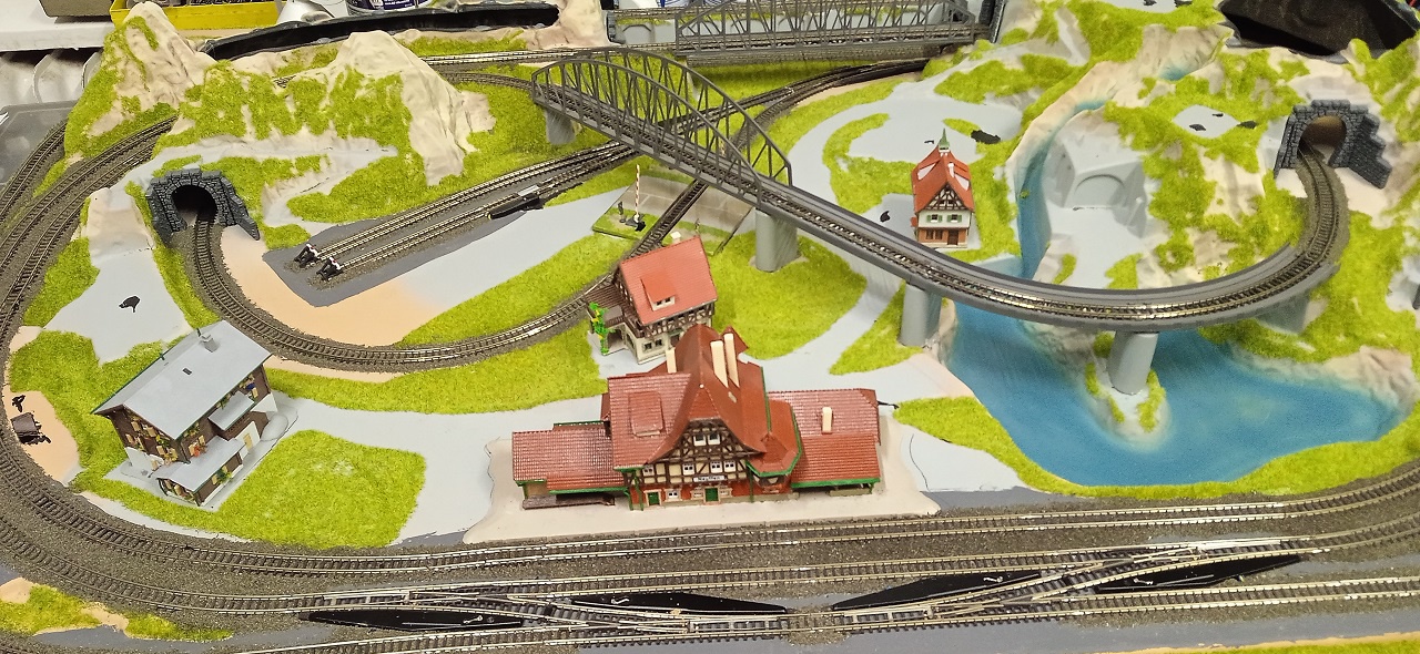 2: Van egy jó ötlet, egy pályavezetéshez, de ezt aztán nyakonöntik mindenféle butasággal. Nézzük ezt a "Cortina-t": A belső pálya egy ovális gyakorlatilag. Képzeljétek el, hogy ezt az oválist középen megfogjuk, összenyomjuk kutacsont formára, és ennek a kutyacsontnak a két végét behajlítjuk egymás fölé. Így relatíve kis területen kapunk egy irgatmatlanul hosszú vonalat. Ez eddig jó! Csak aztán teszünk mellé egy külső oválist egy második vonatnak, és ezzel lehetetlenné tesszük egy tisztességes állomás kialakítását. Az nem állomás, hogy leteszünk egymás nyakára négy váltót az állomásépület elé. Itt is érvényes lenne az elv: a kevesebb több.