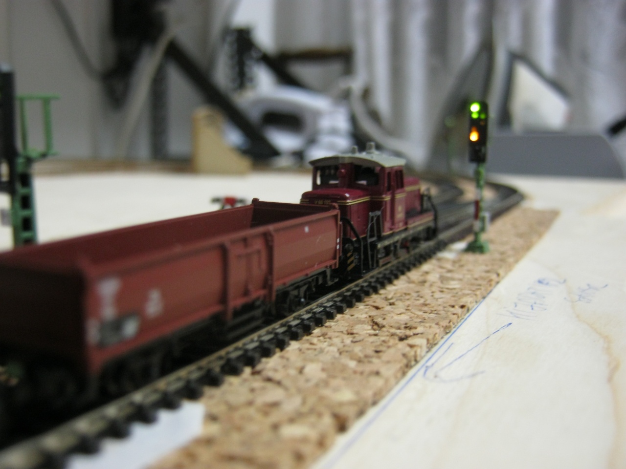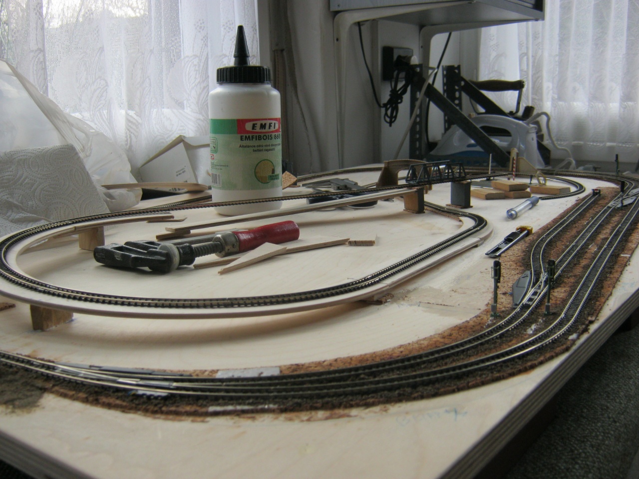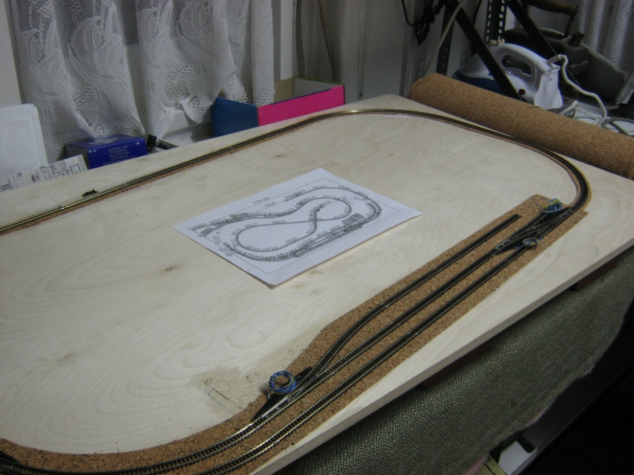 Az első képen már a parafa alátéten ücsörögnek az alsó szinten futó egyvágányú fővonal sínei, egyelőre még ideiglenesen. |