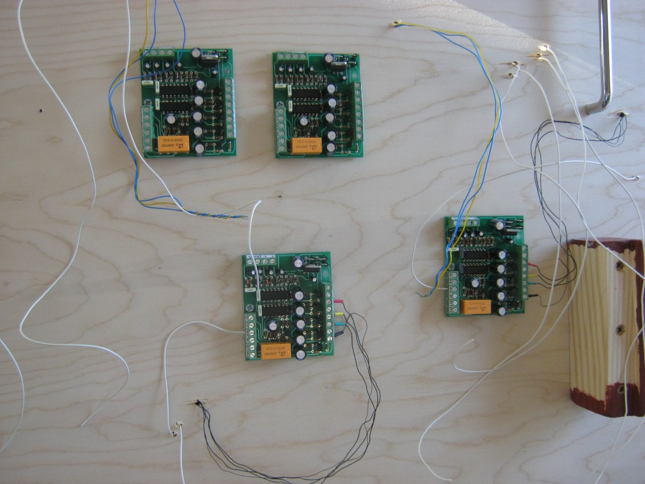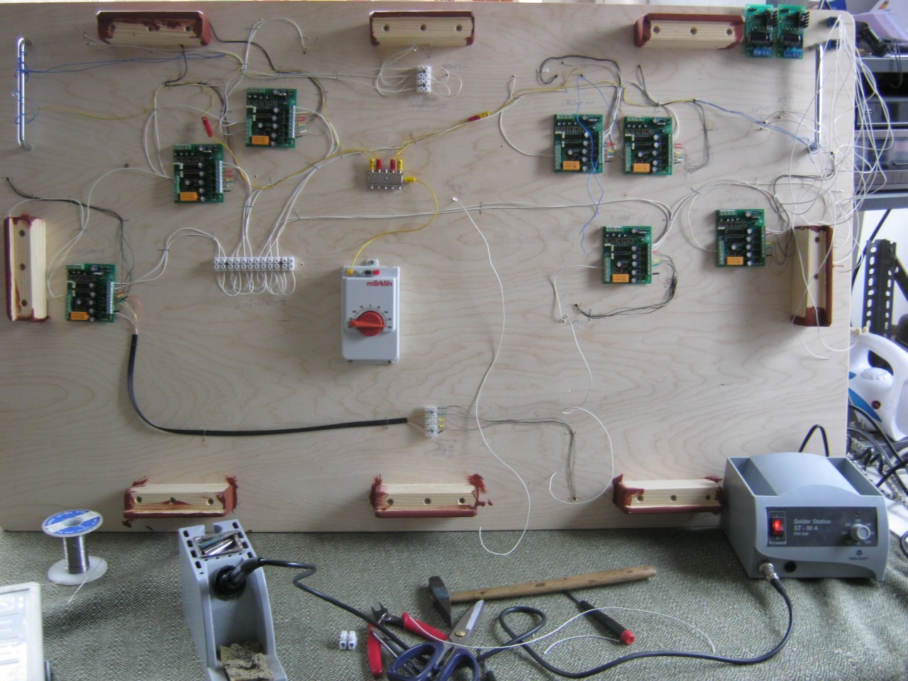 Készen van a "villanyszerelés is, részben, ami a vontatást illeti. Az alsó ovál egy szabályzó (medvend-féle PWM), és a hegyi mellékvonal a másik. A kettő közötti átmenet un. Z-kapcsolás. Vagyis nem fix a két szabályzó. Az átmenet egyik vonalról a másikra úgy valósul meg, hogy mindkét pálya átkapcsolóját az egyik PWM-re váltjuk. Ha az átmenet meg volt, vagyis pl. az alsó állomást a hegyre tartó vonat elhagyta, akkor az alsó pályát át lehet kapcsolni a másik PWM-re. Így nincs "zökkenő" az átmenetkor. Ami még hátra van a "villanyszerelésből, az a váltók működtetése, de ahhoz még meg kell érkezzen a nagykerbe a nyomógomb, mert külön kapcsolópult nem készül, a Märklin pultja meg bumfordi, és - őszinte leszek - nagyon igénytelen kivitel belülről. Ehhez képest a klasszikus BTTB (Zeuke) "zongorabillentyűzet" maga a megtestesült hightech.
