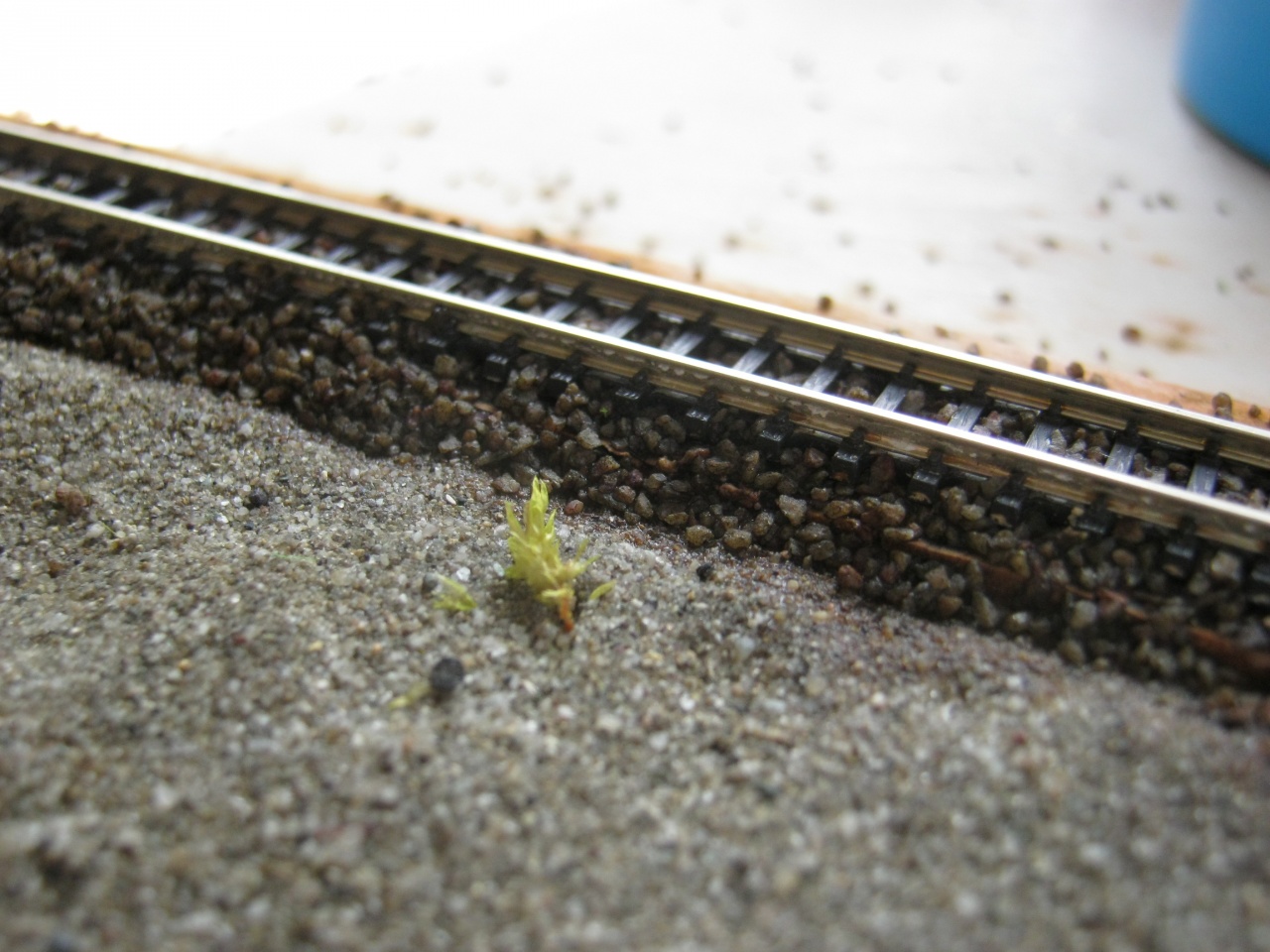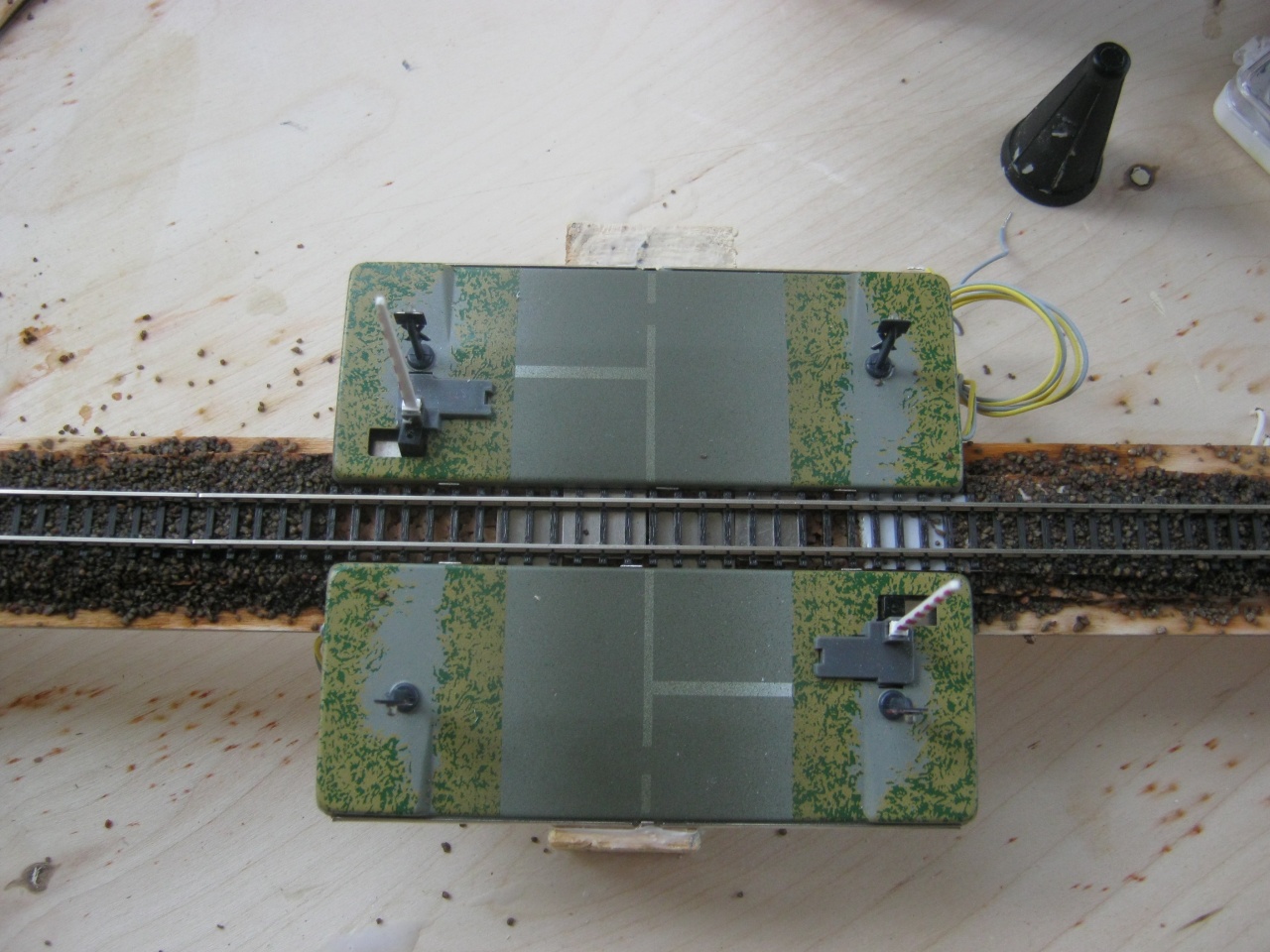 A kapcsolósínek okán keseregtem a Märklin sorompóján, amit be kell építeni. Nos gyári állapotban eléggé lehangoló, és mivel összesen így adják (a dobozon kívül), így a gépkocsivezetők dolga eléggé nehéz lesz, átjutni a síneken, lásd 1739-es képet. A megoldás, a fogpiszkáló, ez a lapos tipusú. Kettő öszeragasztva, és méretre csiszolva, a 1741-es képen. A helyére is került, majd közönséges vízfestékkel be lett festve - okker, fehér, fekete, keverve. Ugye így már kicsit más, a 1745-ös képen?  A festék még szárad, így a hiányzó ágyazatanyag pótlása egy kicsit későbbre marad. |