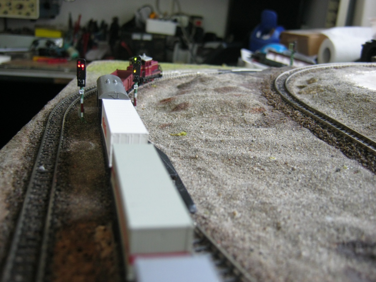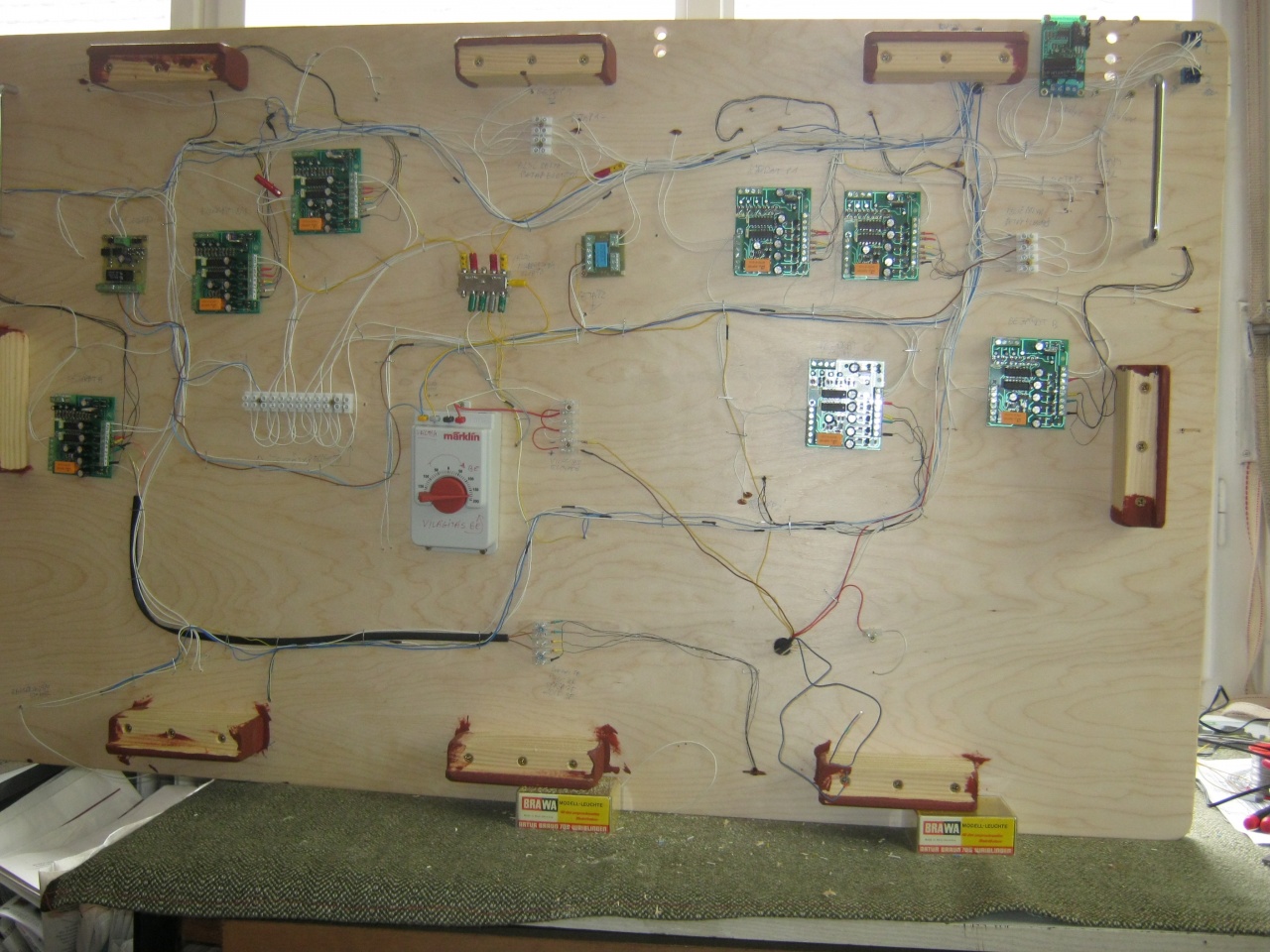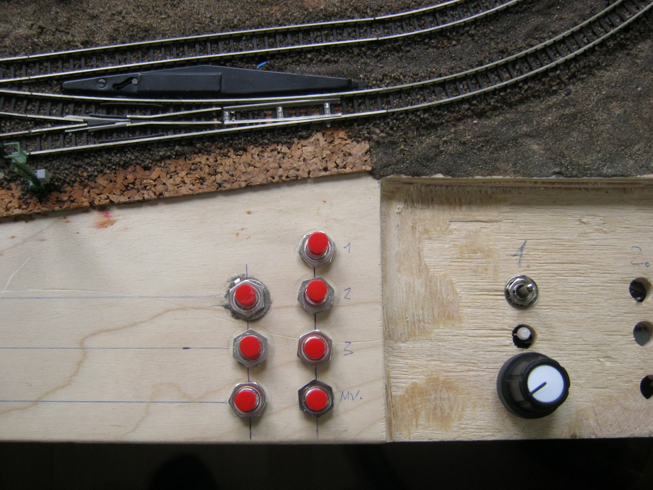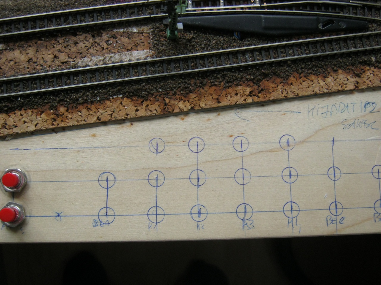 Kicsit bonyolult lesz az alja az asztalnak, de a felszínen csak a vezérlés nyomógombjai és kapcsolói lesznek. A Märklin gyári pultjai köszönik szépen, maradnak dobozban. Sima záró nyomógombokkal van megoldva a vágányutak kapcsolása, vagyis egy nyomógombhoz egy komplett vágányút tartozik. Amik csak jelölésképpen látszanak, mármint a nyomógombok helyei, azok lesznek a jelzők. Csak a mellékvonali fejállomás bejárati alakjelzőjének nyomógombjai vannak még beszerelve, a fővonali állomás fényjelzői kicsit bonyolultabbak lesznek, habár a gomb kevesebb lesz. Ugyanis alul logikailag kötve lesznek a jelzésképek a vágányúthoz. Vagyis a "szabad" jelzés képe a váltók állásához igazodik majd: ha fő irányban van a váltó, akkor zöld lesz a fényjelző, ha kitérőben, akkor zöld/sárga (német lesz az asztal, nem MÁV!). Így a bejárati fényjelzőkhöz csak két-két nyomógomb tartozik majd: mehet a vonat, vagy nem. A kijáratiakhoz pedig három-három: állj, mehet, és a tolatás jelzése. Ezzel helyet lehet spórolni, ugyanis nem kell annyi nyomógomb/kapcsoló, és egyszerűbb lesz a kezelése is: beállítjuk a vágányutat egy nyomógombbal, és a jelző ennek megfelelően fog szabad, vagy lassú jelzést adni az előtte várakozó vonatnak. Vagyis két nyomógombot kell kezelni összesen. Készen van már a szakaszolás vezérlése a mellékvonal hegyi fejállomásán. A vágányok úgy kapnak áramot, ahogy a vágányút áll, kivéve a raktári vágányt. Ez egy külön kapcsolóval lesz majd lekapcsolható, hogy szükség esegén ott is várakozhasson egy tolatómozdony. Ehhez egy CSM115-ös relé is vezérlést kap a váltók nyomógombjairól, ez kapcsolja az áramot arra a szakaszra, ahová a vágányút vezet. |