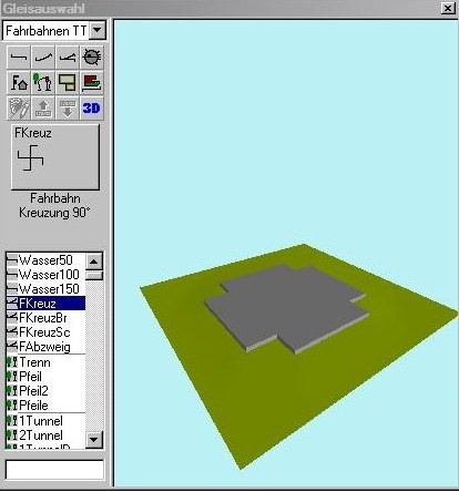 Bingo! eltaláltad  De rosszul emlékeztem, nem a kis kockák között van , hanem a Tillig/PILZ TT-Modell-Gleis -t kell Fahrbahnen TT-re cserélni fent . De ügyesen megoldottad. A patakot is innen lehet terveztetni/rajzoltatni vele . A kereszteződés piktogarmja: hát német program  ööö |