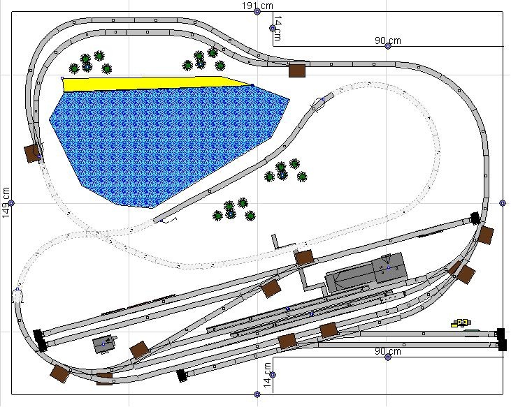 Sok-sok méricskélés és árlista böngészés után átterveztem a pályát. Az alapkoncepció maradt: 3 átmenővágányos állomás amiből kiágazik egy kétvágányos tároló és annak a kihúzója, alul szintén hasonló elrendezésben a mozdonyok tárolására szolgáló "Z" jellegű csonkák. Felül a keresztekhez (hogy a vonatot ott lehessen pihentetni kicsit és ne jöjjön azonnal vissza az állomásra) egy kétvágányos kis állomás ami mellett fő motívumként a tó (elképzelés szerint strand lenne belőle) és mellette két alagút között a "nyílt pálya", hogy ne csak rendezgessem hanem menet közben is lássam a szerelvényeket...
