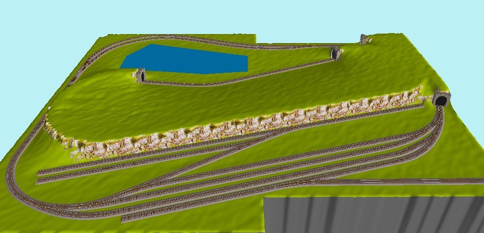 Én a kétvágányos állomást elhagynám, az onnan kigördülő szerelvény vége még az állomáson van, az eleje már a három vágányos állomáson. Ha meg akarod állítani a vonatot valahol, akkor inkább a hegy gyomrában lehetne egy megkerülő vágány. Bemegy a személy vonat, kijön a tehervonat. Lenne meglepetés azoknak akiknek dicsekszel az "asztallal". A tavat tápláló csatornát viszont építenék az asztal széléig, ami fölött egy kis hídon átmegy a vágány, a hídra vezető pálya egy kis töltésen mehetne. (Persze sztorno az egész, ha nálunk veszed a sineket, mert akkor feltétlenül vegyél még 4-5 váltót, sőt hózentróger váltót is  ) |