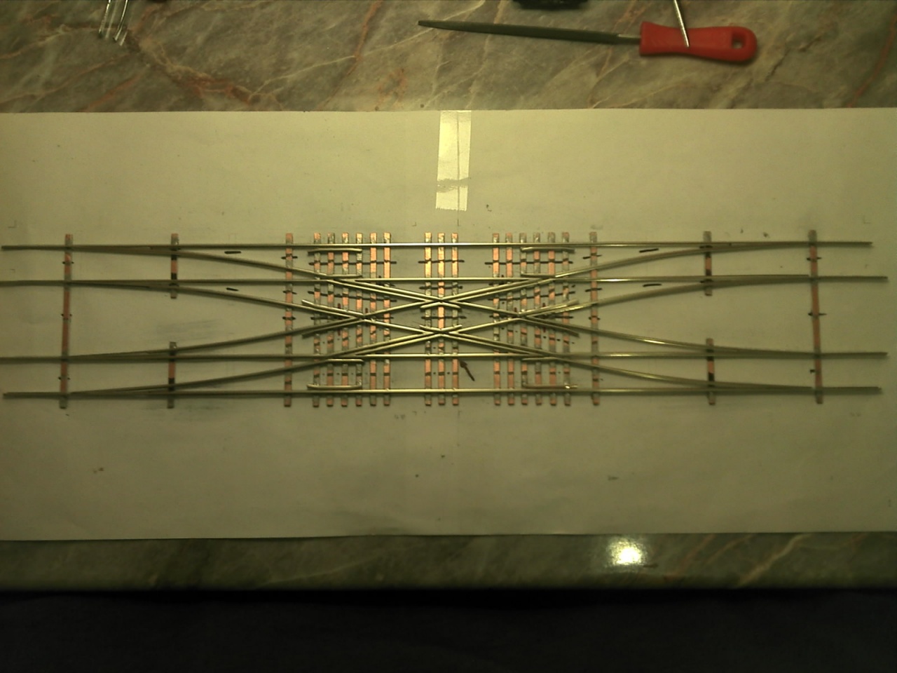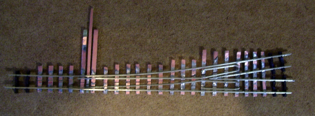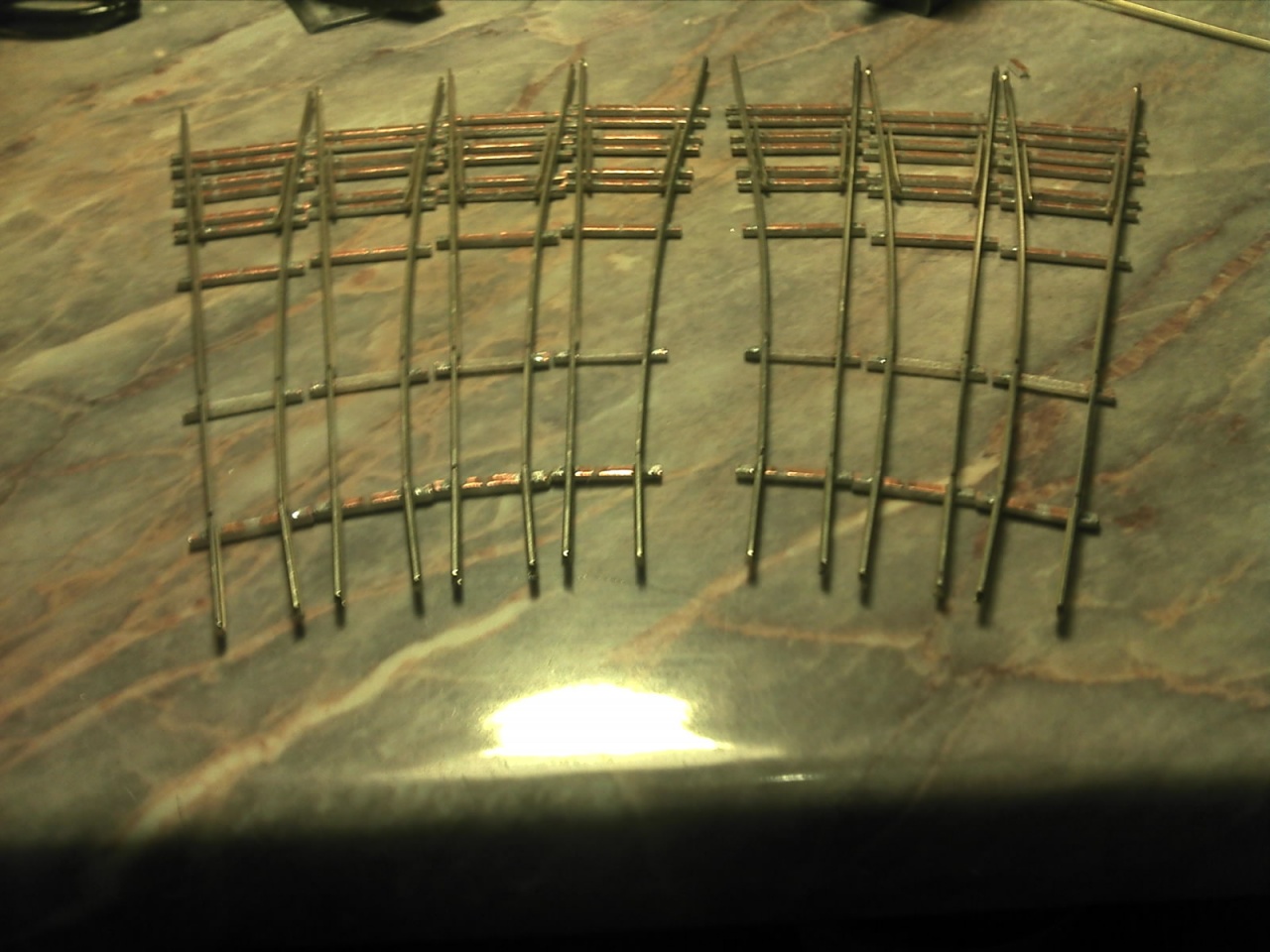 Egy szögsablonnal kialakítom a megfelelő szögeket, egy összeépítő sablonban nyáklapokra forrasztom a sínszálakat. A végén lefestem, majd festett lézervágott rétegelt lemez talpfát ragasztok rá és kész. |