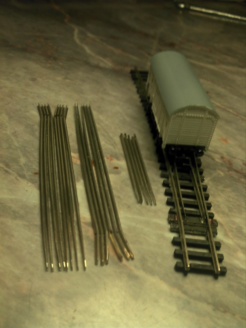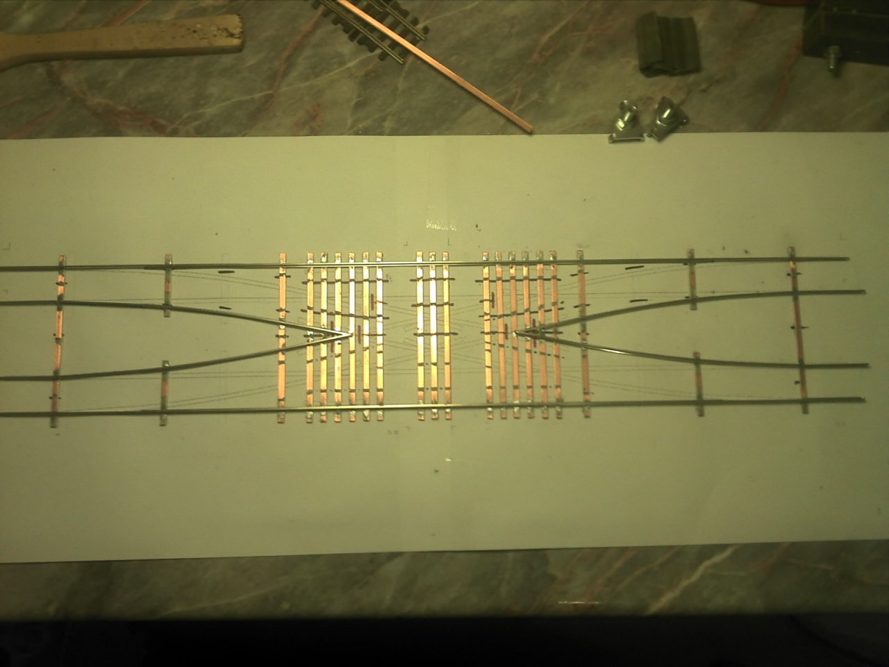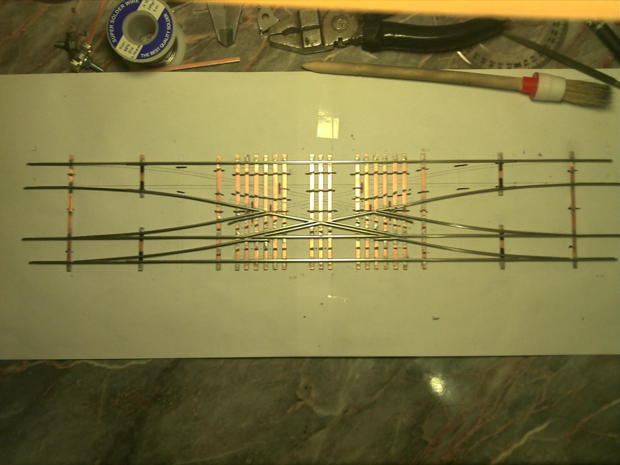 Egy szögsablonnal kialakítom a megfelelő szögeket, egy összeépítő sablonban nyáklapokra forrasztom a sínszálakat. A végén lefestem, majd festett lézervágott rétegelt lemez talpfát ragasztok rá és kész. |